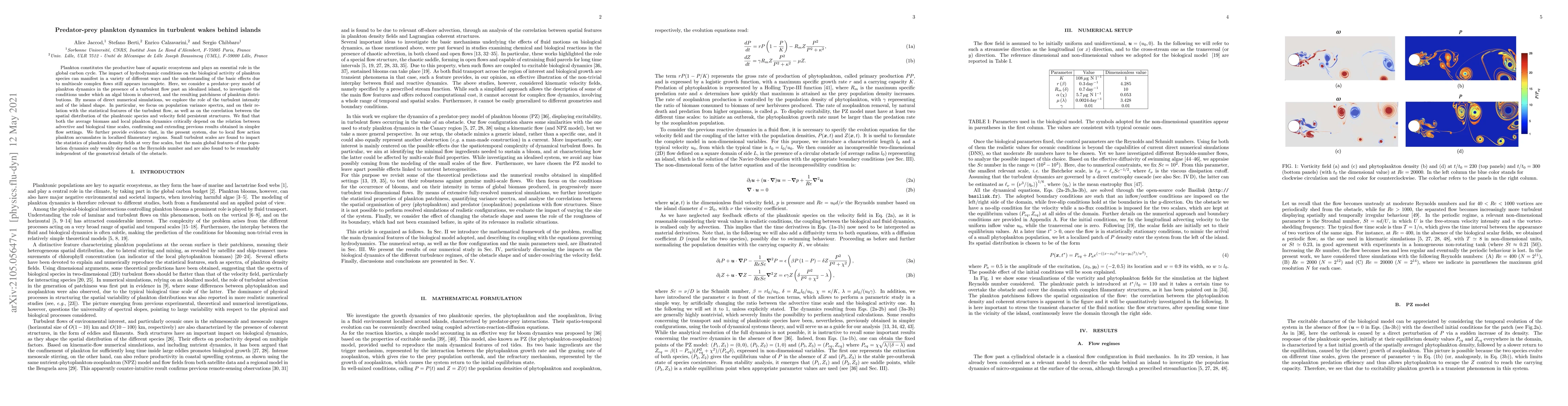 This study investigates predator-prey dynamics of plankton in turbulent wakes behind islands, revealing that local plankton accumulation occurs in filamentary regions due to the flow. The research shows that plankton dynamics and biomass are primarily influenced by the balance between advection and biological processes, rather than the Reynolds number or island shape.