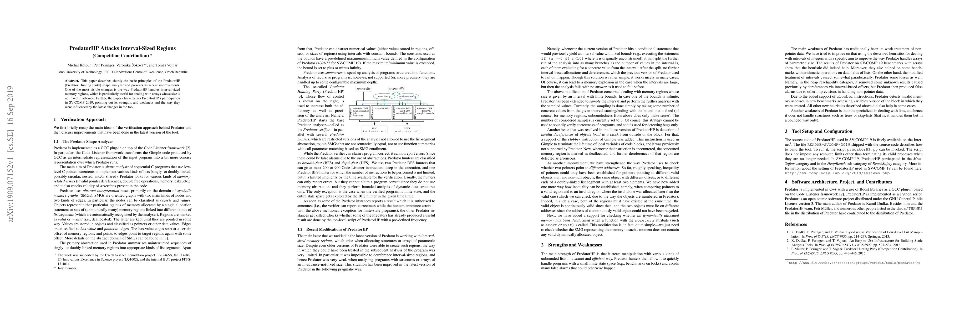 This paper describes shortly the basic principles of the PredatorHP (Predator Hunting Party) shape analyzer and presents its recent improvements. One of the most visible changes is the way PredatorHP handles interval-sized memory regions, which is particularly useful for dealing with arrays whose size is not fixed in advance. Further, the paper characterizes PredatorHP's participation in SV-COMP 2019, pointing out its strengths and weakness and the way they were influenced by the latest changes in the tool.