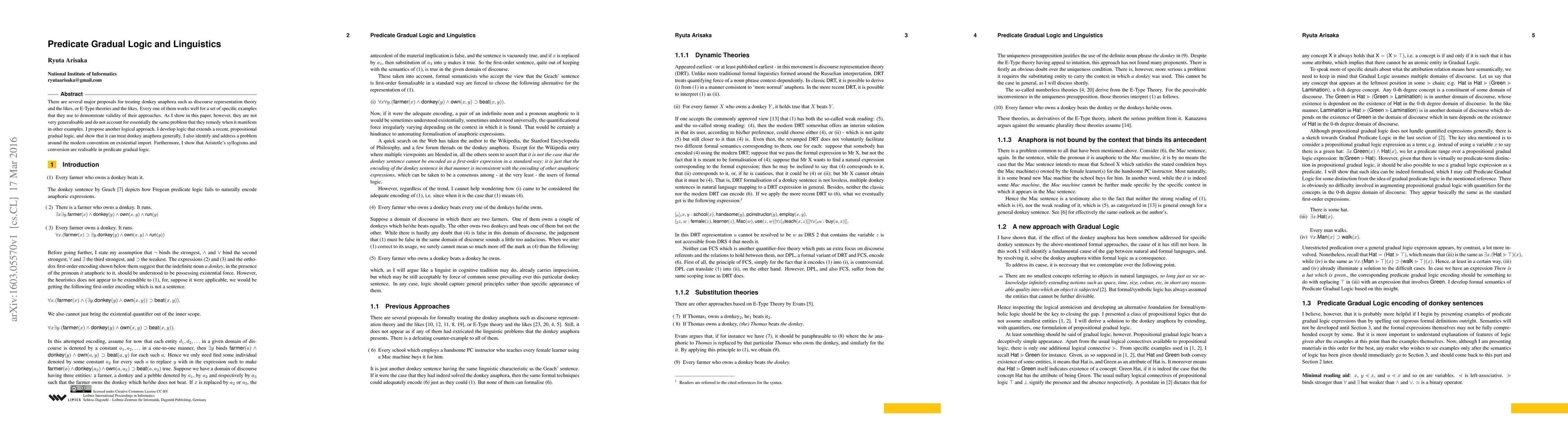 This paper critiques existing theories for handling donkey anaphora and proposes a new gradual logic approach that generalizes these treatments. It extends propositional gradual logic to address the issue of existential import and demonstrates its applicability to Aristotelian syllogisms.