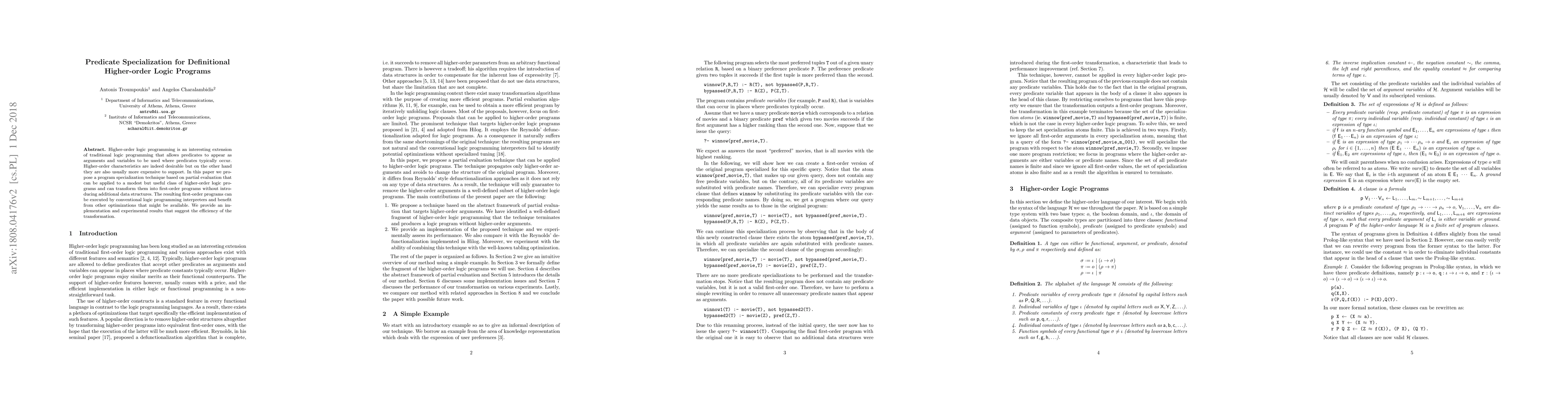 This paper proposes a technique for predicate specialization in definitional higher-order logic programs, transforming them into first-order programs via partial evaluation. The transformation maintains efficiency and allows conventional logic programming interpreters to execute the optimized first-order programs.