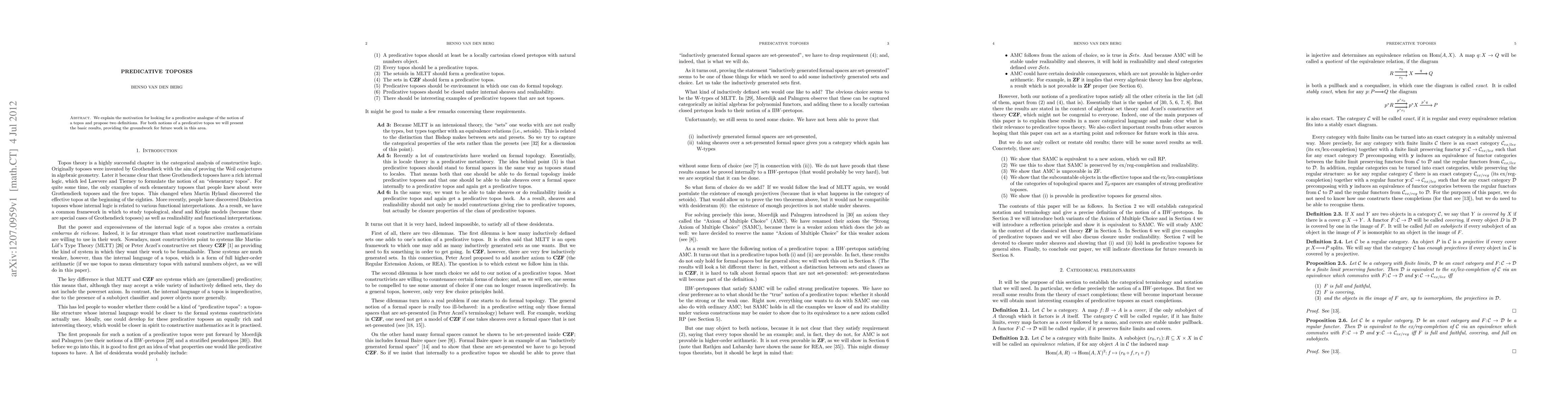 This paper seeks a predicative version of toposes, proposing two definitions and presenting foundational results to lay the groundwork for further research in this area. The study aims to explore predicative analogues to enhance the foundational aspects of topos theory.