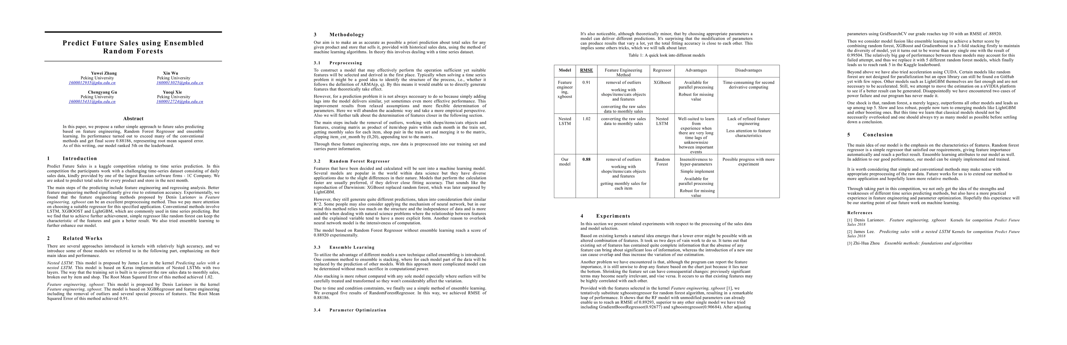 This is a method report for the Kaggle data competition 'Predict future sales'. In this paper, we propose a rather simple approach to future sales predicting based on feature engineering, Random Forest Regressor and ensemble learning. Its performance turned out to exceed many of the conventional methods and get final score 0.88186, representing root mean squared error. As of this writing, our model ranked 5th on the leaderboard. (till 8.5.2018)