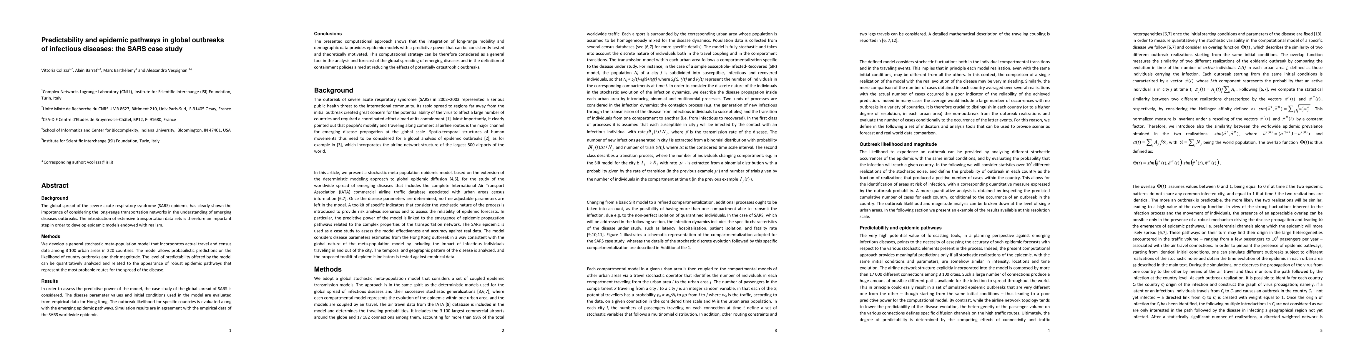 Background: The global spread of the severe acute respiratory syndrome (SARS) epidemic has clearly shown the importance of considering the long-range transportation networks in the understanding of emerging diseases outbreaks. The introduction of extensive transportation data sets is therefore an important step in order to develop epidemic models endowed with realism. Methods: We develop a general stochastic meta-population model that incorporates actual travel and census data among 3 100 urban areas in 220 countries. The model allows probabilistic predictions on the likelihood of country outbreaks and their magnitude. The level of predictability offered by the model can be quantitatively analyzed and related to the appearance of robust epidemic pathways that represent the most probable routes for the spread of the disease. Results: In order to assess the predictive power of the model, the case study of the global spread of SARS is considered. The disease parameter values and initial conditions used in the model are evaluated from empirical data for Hong Kong. The outbreak likelihood for specific countries is evaluated along with the emerging epidemic pathways. Simulation results are in agreement with the empirical data of the SARS worldwide epidemic. Conclusions: The presented computational approach shows that the integration of long-range mobility and demographic data provides epidemic models with a predictive power that can be consistently tested and theoretically motivated. This computational strategy can be therefore considered as a general tool in the analysis and forecast of the global spreading of emerging diseases and in the definition of containment policies aimed at reducing the effects of potentially catastrophic outbreaks.