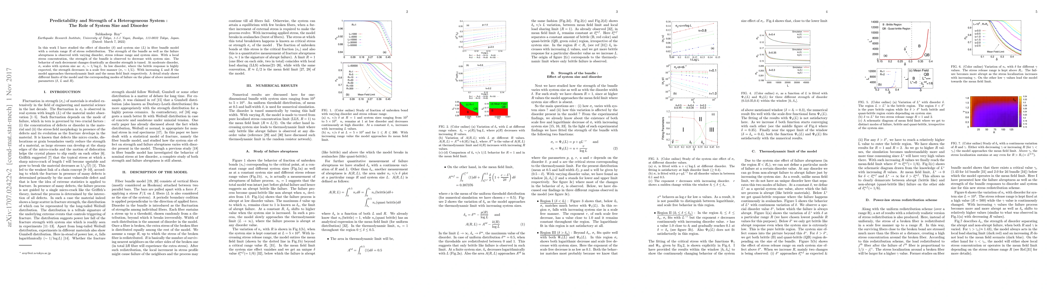 This paper investigates the impact of disorder and system size on the strength and predictability of a fiber bundle model, revealing that strength decreases with system size under local stress concentration. The critical stress scales inversely logarithmically with system size at moderate disorder, while in low disorder, strength decreases in a scale-free manner.