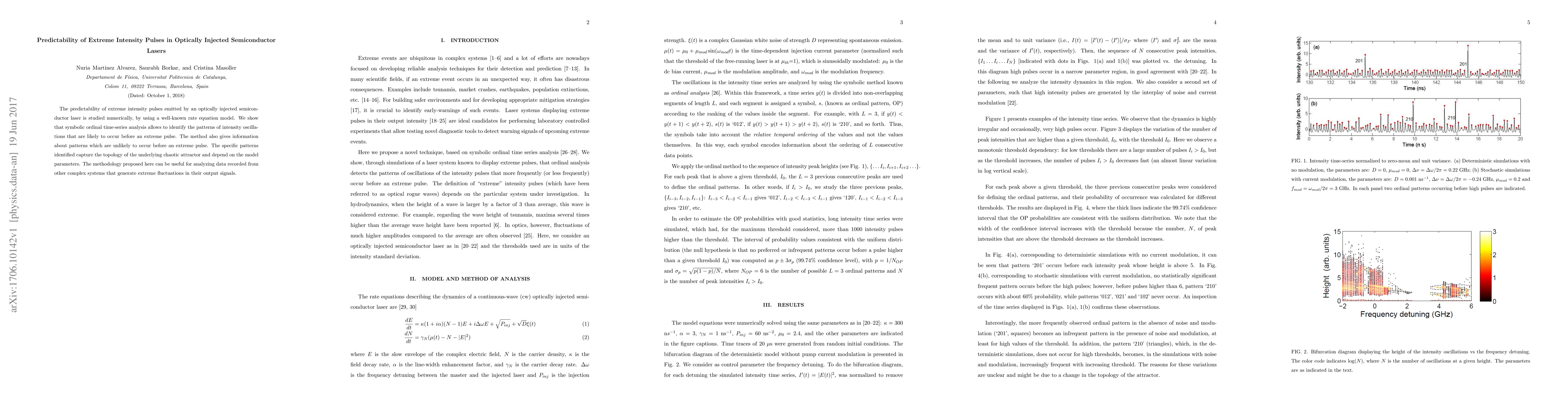 The predictability of extreme intensity pulses emitted by an optically injected semiconductor laser is studied numerically, by using a well-known rate equation model. We show that symbolic ordinal time-series analysis allows to identify the patterns of intensity oscillations that are likely to occur before an extreme pulse. The method also gives information about patterns which are unlikely to occur before an extreme pulse. The specific patterns identified capture the topology of the underlying chaotic attractor and depend on the model parameters. The methodology proposed here can be useful for analyzing data recorded from other complex systems that generate extreme fluctuations in their output signals.