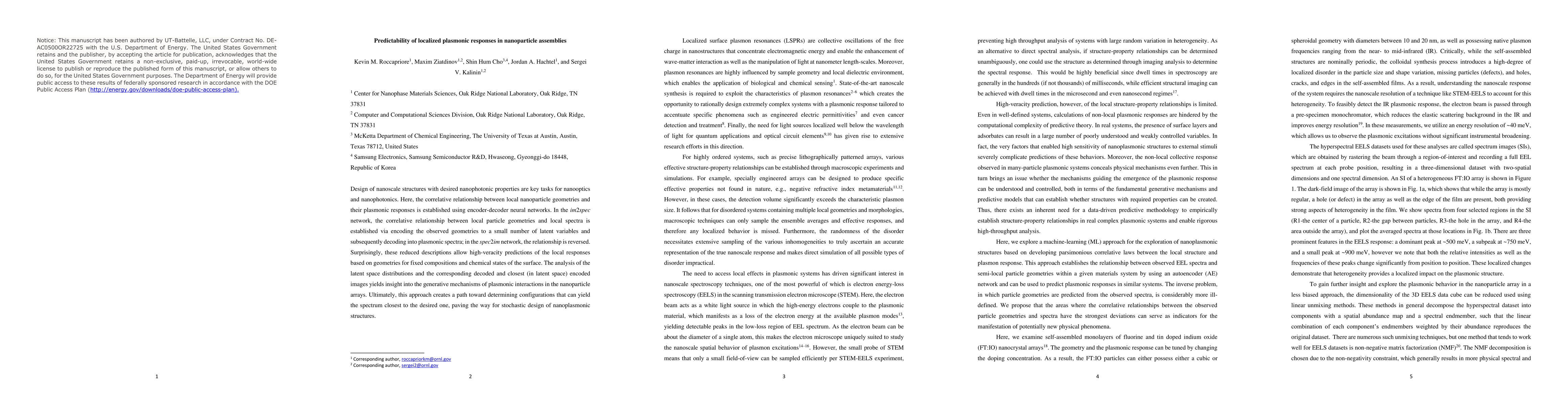 Design of nanoscale structures with desired nanophotonic properties are key tasks for nanooptics and nanophotonics. Here, the correlative relationship between local nanoparticle geometries and their plasmonic responses is established using encoder-decoder neural networks. In the im2spec network, the correlative relationship between local particle geometries and local spectra is established via encoding the observed geometries to a small number of latent variables and subsequently decoding into plasmonic spectra; in the spec2im network, the relationship is reversed. Surprisingly, these reduced descriptions allow high-veracity predictions of the local responses based on geometries for fixed compositions and chemical states of the surface. The analysis of the latent space distributions and the corresponding decoded and closest (in latent space) encoded images yields insight into the generative mechanisms of plasmonic interactions in the nanoparticle arrays. Ultimately, this approach creates a path toward determining configurations that can yield the spectrum closest to the desired one, paving the way for stochastic design of nanoplasmonic structures.