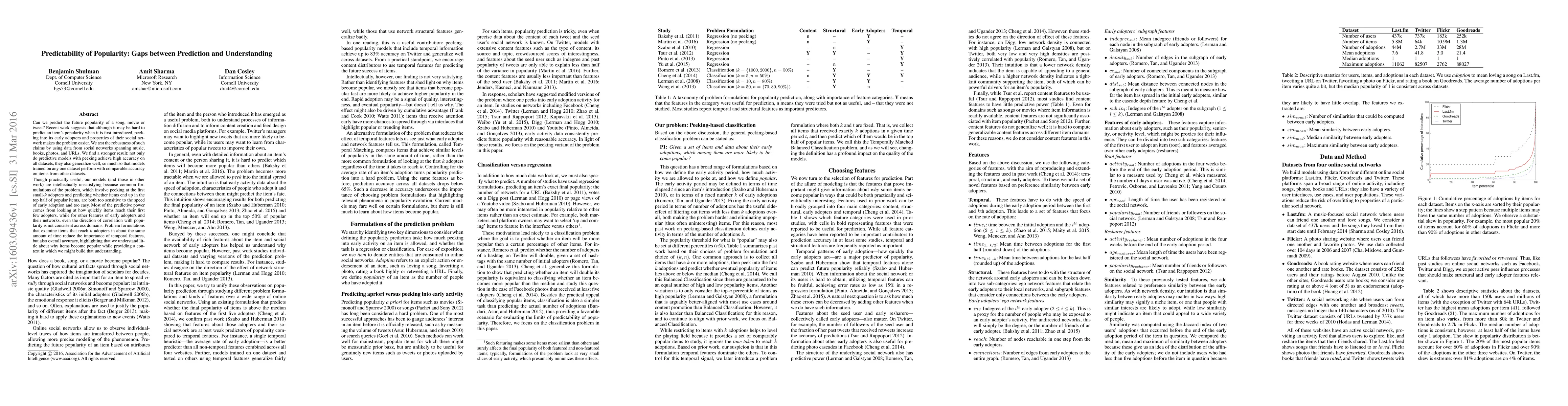 Can we predict the future popularity of a song, movie or tweet? Recent work suggests that although it may be hard to predict an item's popularity when it is first introduced, peeking into its early adopters and properties of their social network makes the problem easier. We test the robustness of such claims by using data from social networks spanning music, books, photos, and URLs. We find a stronger result: not only do predictive models with peeking achieve high accuracy on all datasets, they also generalize well, so much so that models trained on any one dataset perform with comparable accuracy on items from other datasets. Though practically useful, our models (and those in other work) are intellectually unsatisfying because common formulations of the problem, which involve peeking at the first small-k adopters and predicting whether items end up in the top half of popular items, are both too sensitive to the speed of early adoption and too easy. Most of the predictive power comes from looking at how quickly items reach their first few adopters, while for other features of early adopters and their networks, even the direction of correlation with popularity is not consistent across domains. Problem formulations that examine items that reach k adopters in about the same amount of time reduce the importance of temporal features, but also overall accuracy, highlighting that we understand little about why items become popular while providing a context in which we might build that understanding.