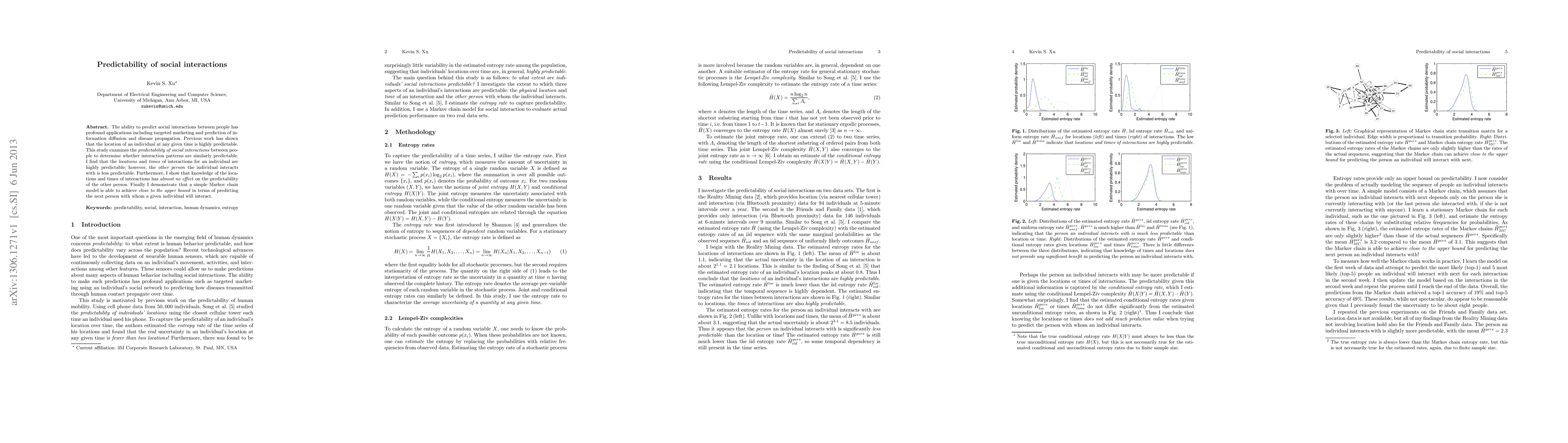 This study investigates the predictability of social interactions, finding that while the locations and times of interactions are highly predictable, the individuals involved are less so. A simple Markov chain model nearly reaches the upper limit in predicting future interaction partners.