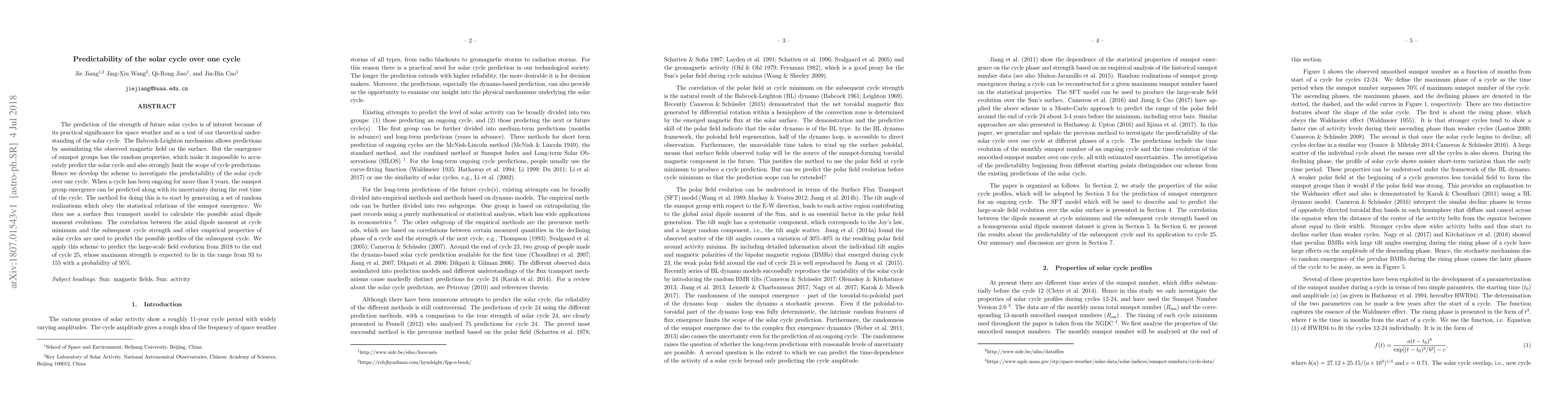 The prediction of the strength of future solar cycles is of interest because of its practical significance for space weather and as a test of our theoretical understanding of the solar cycle. The Babcock-Leighton mechanism allows predictions by assimilating the observed magnetic field on the surface. But the emergence of sunspot groups has the random properties, which make it impossible to accurately predict the solar cycle and also strongly limit the scope of cycle predictions. Hence we develop the scheme to investigate the predictability of the solar cycle over one cycle. When a cycle has been ongoing for more than 3 years, the sunspot group emergence can be predicted along with its uncertainty during the rest time of the cycle. The method for doing this is to start by generating a set of random realizations which obey the statistical relations of the sunspot emergence. We then use a surface flux transport model to calculate the possible axial dipole moment evolutions. The correlation between the axial dipole moment at cycle minimum and the subsequent cycle strength and other empirical properties of solar cycles are used to predict the possible profiles of the subsequent cycle. We apply this scheme to predict the large-scale field evolution from 2018 to the end of cycle 25, whose maximum strength is expected to lie in the range from 93 to 155 with a probability of 95\%.