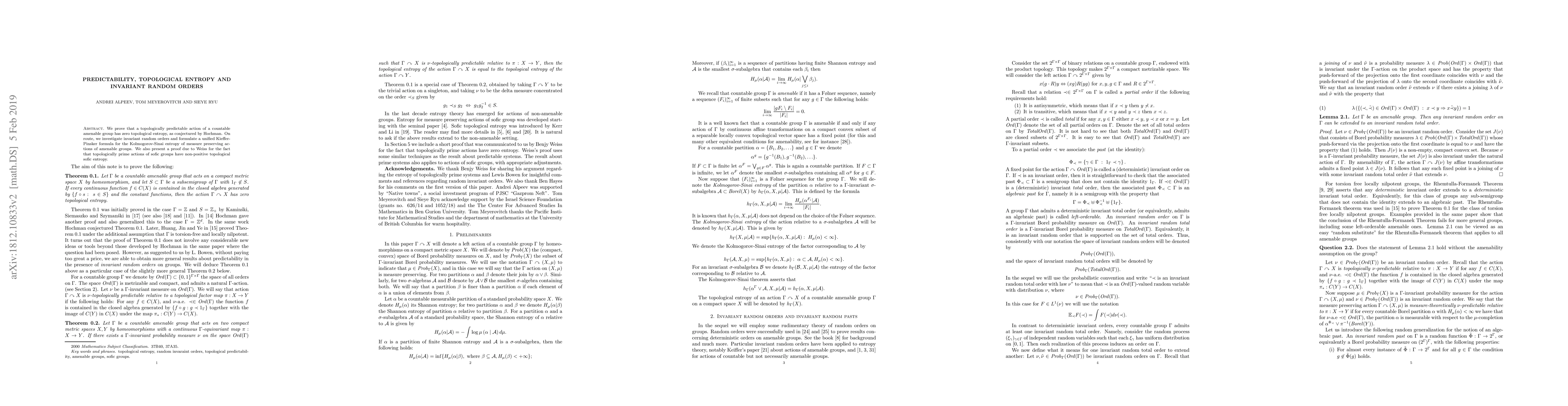 This paper demonstrates that topologically predictable actions by countable amenable groups have zero topological entropy, confirming Hochman's conjecture. It also explores invariant random orders and presents a unified formula for the Kolmogorov-Sinai entropy of measure-preserving actions of amenable groups.