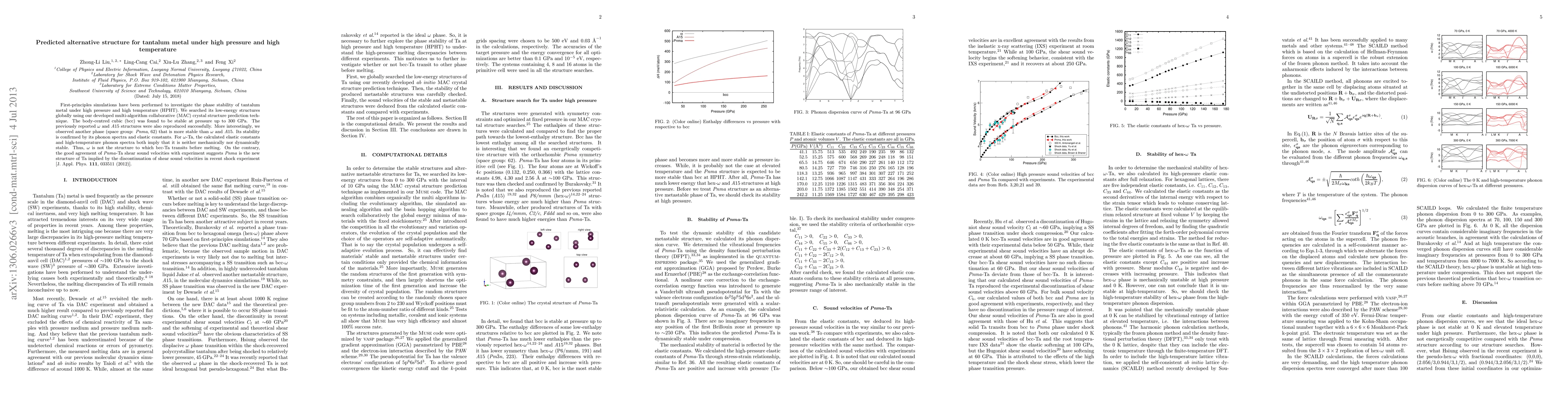 First-principles simulations have been performed to investigate the phase stability of tantalum metal under high pressure and high temperature (HPHT). We searched its low-energy structures globally using our developed multi-algorithm collaborative (MAC) crystal structure prediction technique. The body-centred cubic (bcc) was found to be stable at pressure up to 300 GPa. The previously reported $\omega$ and \textit{A}15 structures were also reproduced successfully. More interestingly, we observed another phase (space group: \textit{Pnma}, 62) that is more stable than $\omega$ and \textit{A}15. Its stability is confirmed by its phonon spectra and elastic constants. For $\omega$-Ta, the calculated elastic constants and high-temperature phonon spectra both imply that it is neither mechanically nor dynamically stable. Thus, $\omega$ is not the structure to which bcc-Ta transits before melting. On the contrary, the good agreement of \textit{Pnma}-Ta shear sound velocities with experiment suggests \textit{Pnma} is the new structure of Ta implied by the discontinuation of shear sound velocities in recent shock experiment [J. Appl. Phys. \textbf{111}, 033511 (2012)].