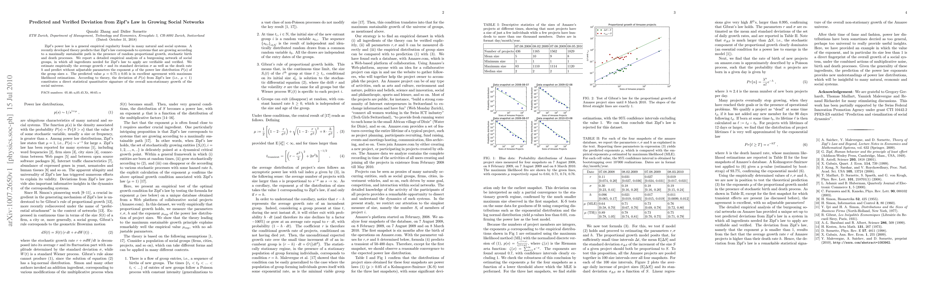 Zipf's power law is a general empirical regularity found in many natural and social systems. A recently developed theory predicts that Zipf's law corresponds to systems that are growing according to a maximally sustainable path in the presence of random proportional growth, stochastic birth and death processes. We report a detailed empirical analysis of a burgeoning network of social groups, in which all ingredients needed for Zipf's law to apply are verifiable and verified. We estimate empirically the average growth $r$ and its standard deviation $\sigma$ as well as the death rate $h$ and predict without adjustable parameters the exponent $\mu$ of the power law distribution $P(s)$ of the group sizes $s$. The predicted value $\mu = 0.75 \pm 0.05$ is in excellent agreement with maximum likelihood estimations. According to theory, the deviation of $P(s)$ from Zipf's law (i.e., $\mu < 1$) constitutes a direct statistical quantitative signature of the overall non-stationary growth of the social universe.