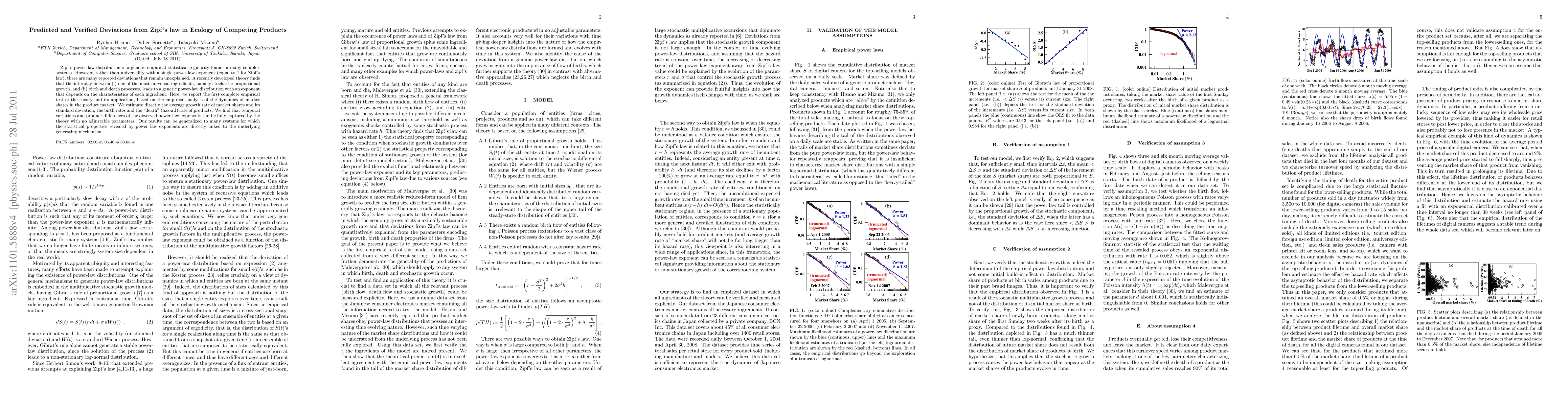 Zipf's power-law distribution is a generic empirical statistical regularity found in many complex systems. However, rather than universality with a single power-law exponent (equal to 1 for Zipf's law), there are many reported deviations that remain unexplained. A recently developed theory finds that the interplay between (i) one of the most universal ingredients, namely stochastic proportional growth, and (ii) birth and death processes, leads to a generic power-law distribution with an exponent that depends on the characteristics of each ingredient. Here, we report the first complete empirical test of the theory and its application, based on the empirical analysis of the dynamics of market shares in the product market. We estimate directly the average growth rate of market shares and its standard deviation, the birth rates and the "death" (hazard) rate of products. We find that temporal variations and product differences of the observed power-law exponents can be fully captured by the theory with no adjustable parameters. Our results can be generalized to many systems for which the statistical properties revealed by power law exponents are directly linked to the underlying generating mechanism.