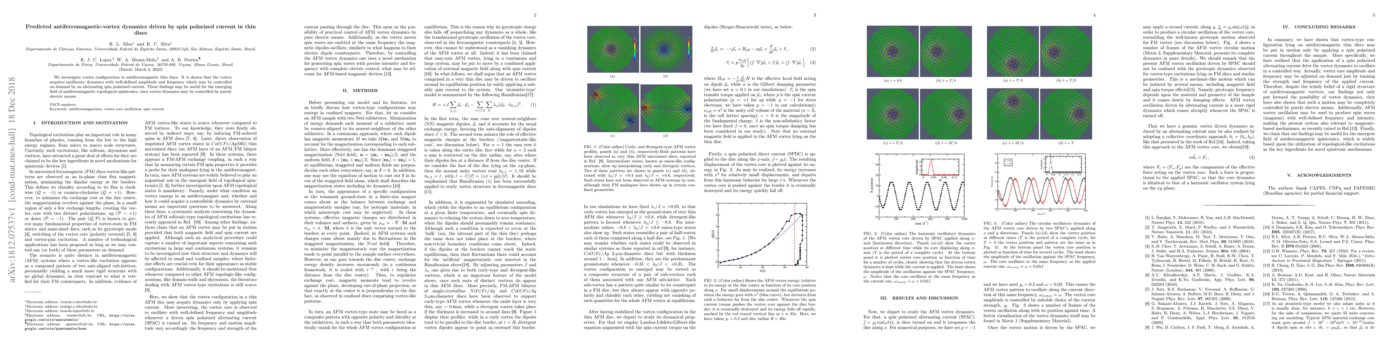 This paper explores the oscillatory dynamics of vortices in antiferromagnetic thin discs, driven by spin-polarized current, revealing controllable amplitude and frequency. These findings hold potential for advancing antiferromagnetic topological spintronics through electric manipulation of vortex behavior.