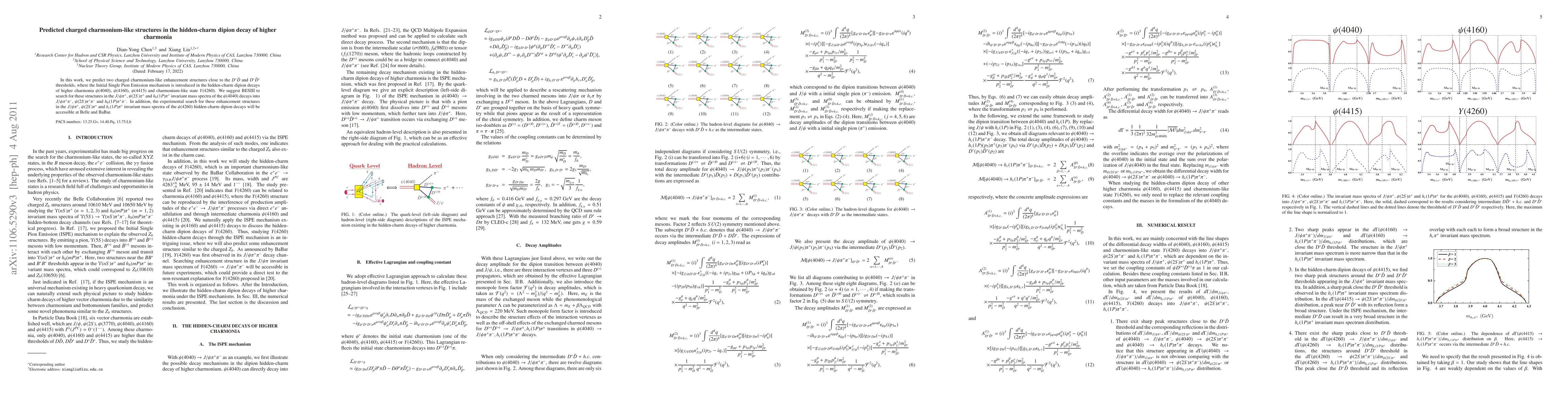 In this work, we predict two charged charmonium-like structures close to the $D^\ast\bar{D}$ and $D^\ast\bar{D}^\ast$ thresholds, where the Initial Single Pion Emission mechanism is introduced in the hidden-charm dipion decays of higher charmonia $\psi(4040)$, $\psi(4160)$, $\psi(4415)$ and charmonium-like state Y(4260). We suggest BESIII to search for these structures in the $J/\psi\pi^+$, $\psi(2S)\pi^+$ and $h_b(1P)\pi^+$ invariant mass spectra of the $\psi(4040)$ decays into $J/\psi\pi^+\pi^-$, $\psi(2S)\pi^+\pi^-$ and $h_b(1P)\pi^+\pi^-$. In addition, the experimental search for these structures in the $J/\psi\pi^+$, $\psi(2S)\pi^+$ and $h_c(1P)\pi^+$ invariant mass spectra of the $\psi(4260)$ hidden-charm dipion decays will be accessible at Belle and BaBar.