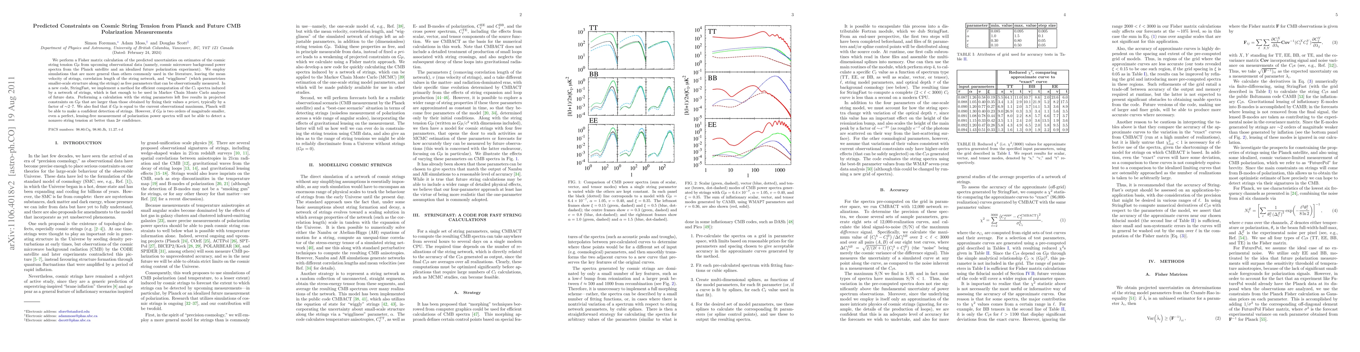 This paper uses Fisher matrix calculations and simulations to predict constraints on cosmic string tension Gμ from Planck and future CMB polarization data. It finds that allowing string parameters like velocity and structure to vary can improve constraints by a factor of 2-7 compared to fixed values, and that Planck could detect strings if Gμ is near the current maximum, but not if it's much smaller.
