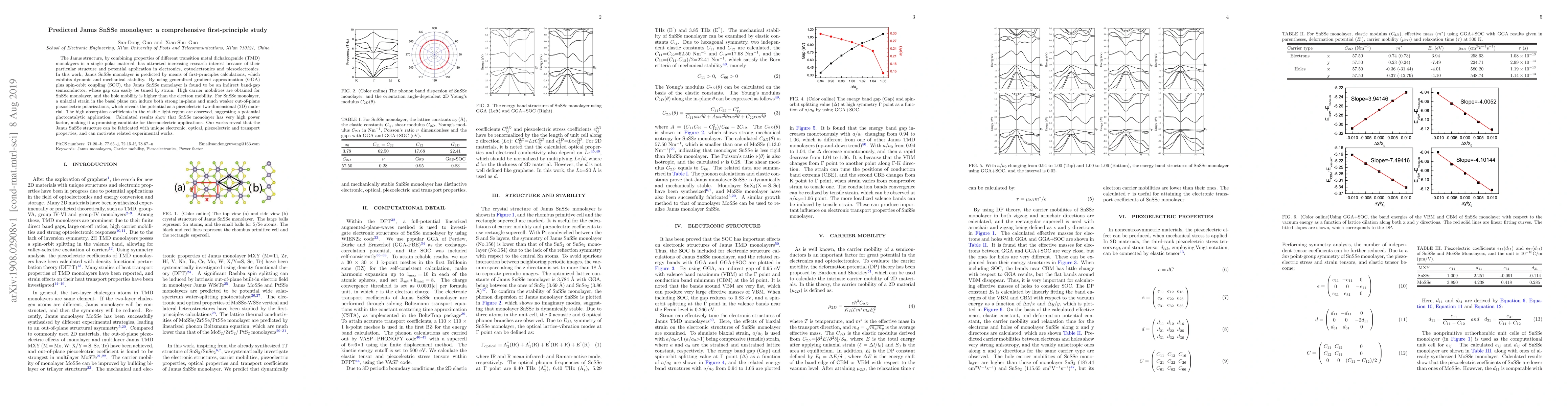 This study predicts the Janus SnSSe monolayer using first-principles calculations, revealing its dynamic and mechanical stability, tunable indirect band-gap semiconductor properties, high carrier mobility, and potential for piezoelectric, photocatalytic, and thermoelectric applications. The material's unique electronic, optical, and transport properties suggest promising future applications.