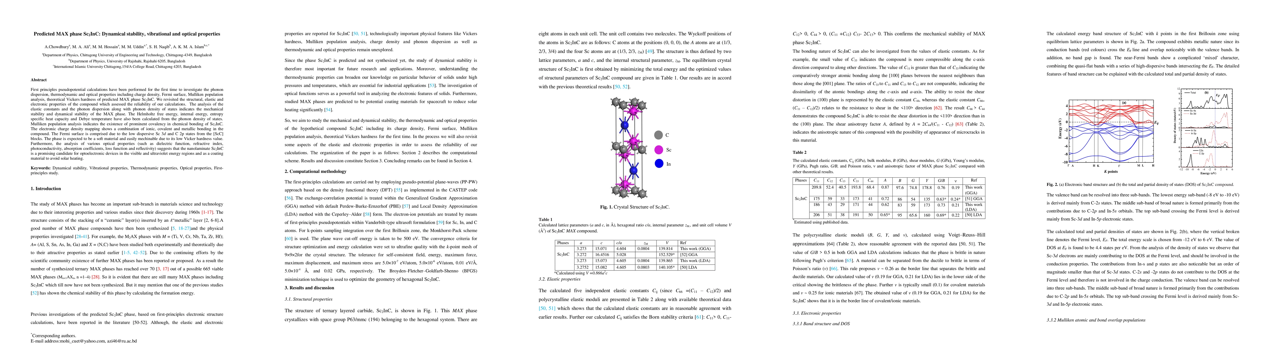 This study uses computational methods to analyze a new MAX phase, Sc2InC. It confirms the compound's mechanical and dynamical stability, revealing a mix of ionic, covalent, and metallic bonding. The phase is predicted to be soft and machinable, with potential applications in optoelectronic devices and as a coating material to reduce solar heating.