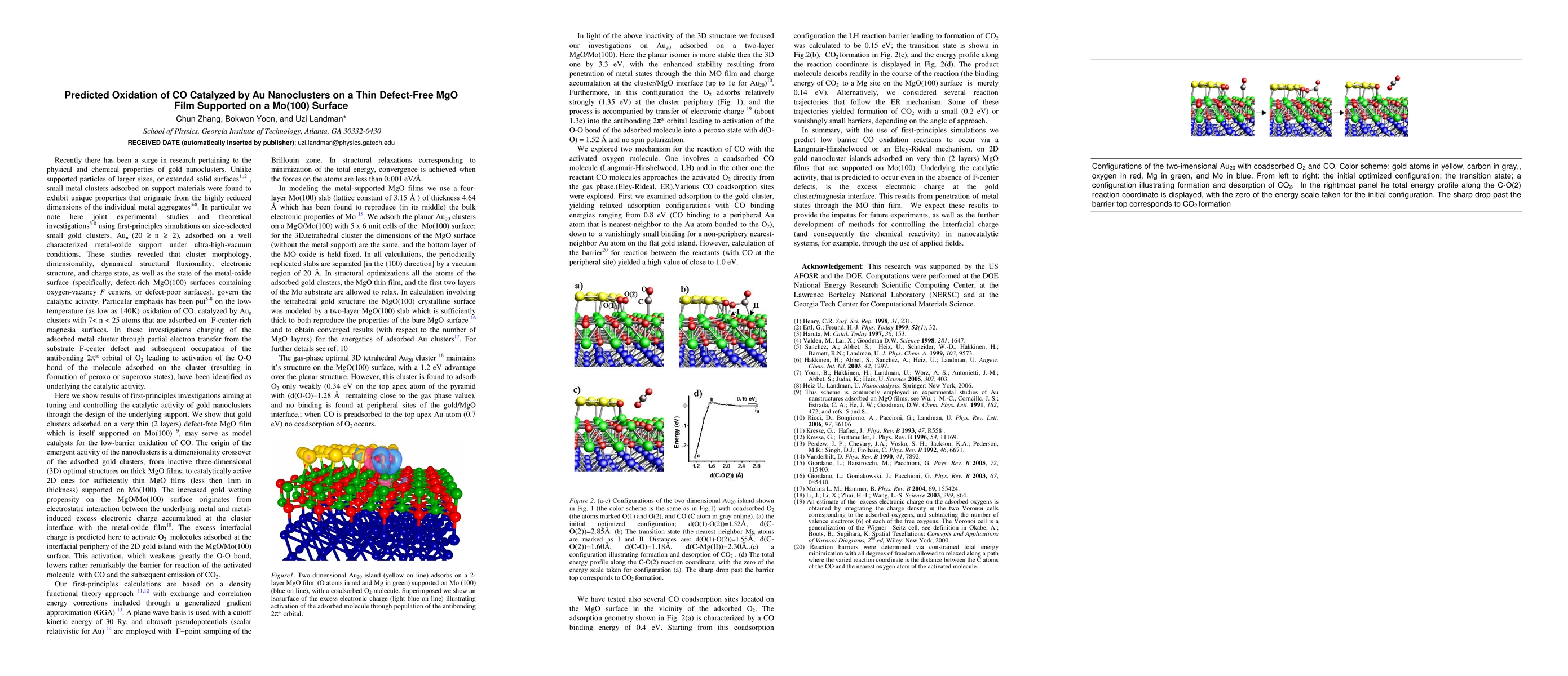 Theoretical model predicting low barrier CO oxidation reactions on 2D gold nanocluster islands adsorbed on very thin MgO films, highlighting the role of excess electronic charge in catalytic activity.