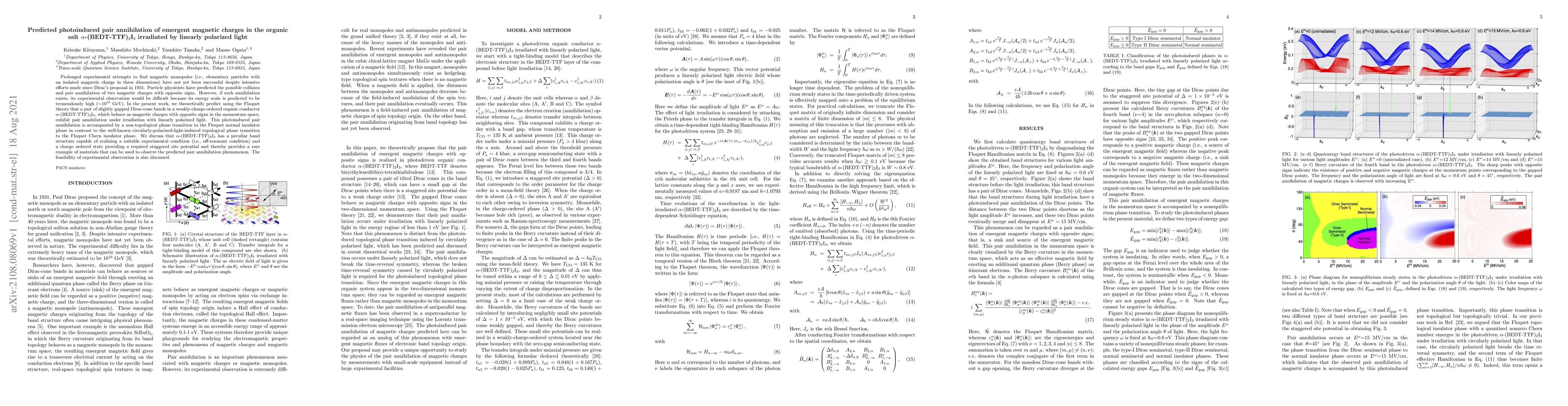 This paper theoretically predicts that $\alpha$-(BEDT-TTF)$_2$I$_3$ can exhibit photoinduced pair annihilation of emergent magnetic charges under linearly polarized light, contrasting with circularly polarized light-induced topological phase transitions. The study suggests the material's unique band structure may enable experimental observation of this predicted phenomenon.