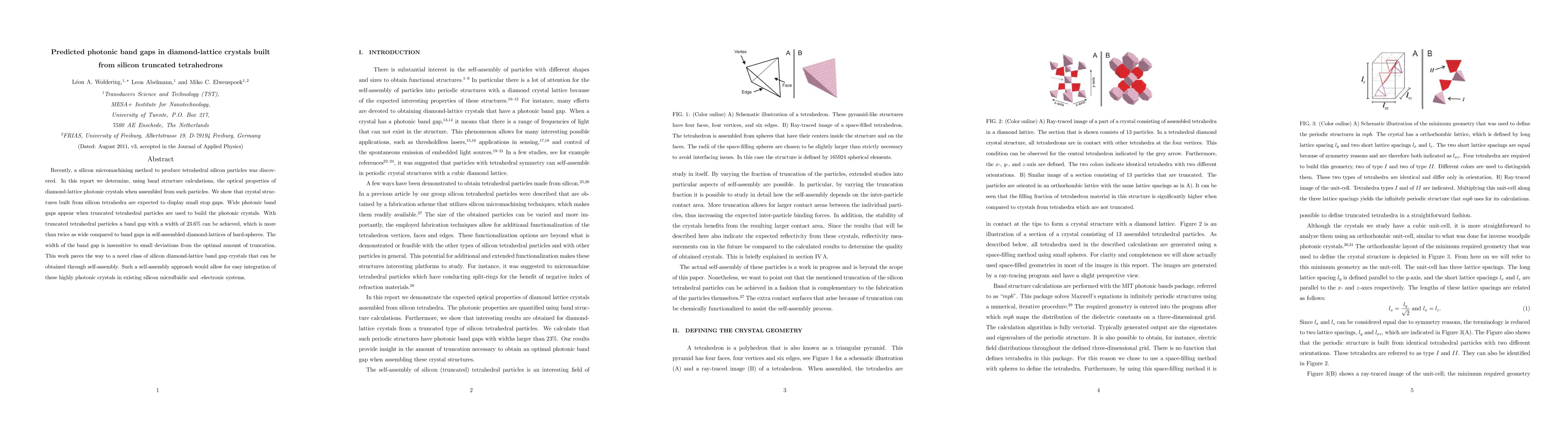 Recently, a silicon micromachining method to produce tetrahedral silicon particles was discovered. In this report we determine, using band structure calculations, the optical properties of diamond-lattice photonic crystals when assembled from such particles. We show that crystal structures built from silicon tetrahedra are expected to display small stop gaps. Wide photonic band gaps appear when truncated tetrahedral particles are used to build the photonic crystals. With truncated tetrahedral particles a band gap with a width of 23.6% can be achieved, which is more than twice as wide compared to band gaps in self-assembled diamond-lattices of hard-spheres. The width of the band gap is insensitive to small deviations from the optimal amount of truncation. This work paves the way to a novel class of silicon diamond-lattice band gap crystals that can be obtained through self-assembly. Such a self-assembly approach would allow for easy integration of these highly photonic crystals in existing silicon microfluidic and -electronic systems.
