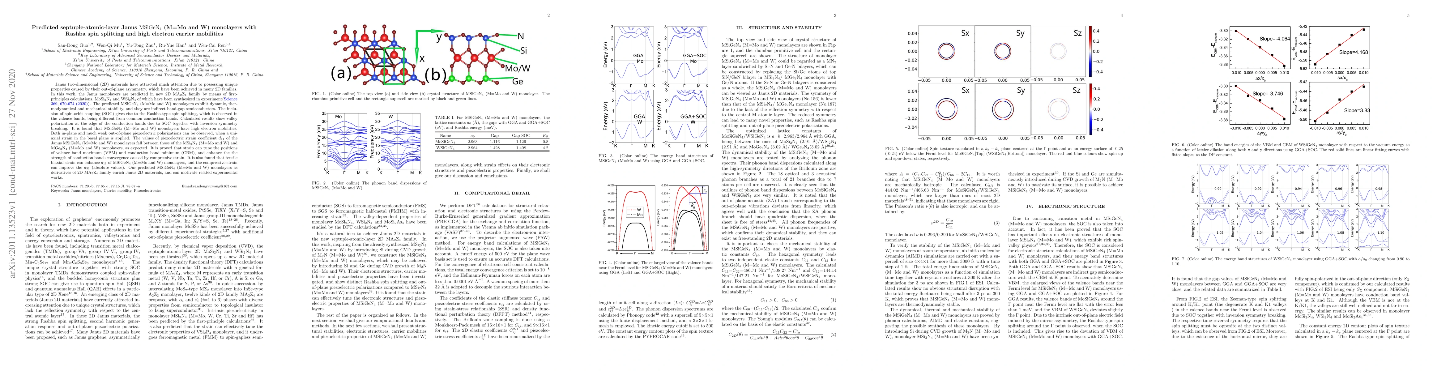 This paper predicts the existence of stable septuple-atomic-layer Janus $\mathrm{MSiGeN_4}$ (M=Mo and W) monolayers with unique properties due to their out-of-plane asymmetry. These materials exhibit high electron mobilities, Rashba spin splitting, and tunable piezoelectric properties under strain, making them promising for advanced electronic and optoelectronic applications.