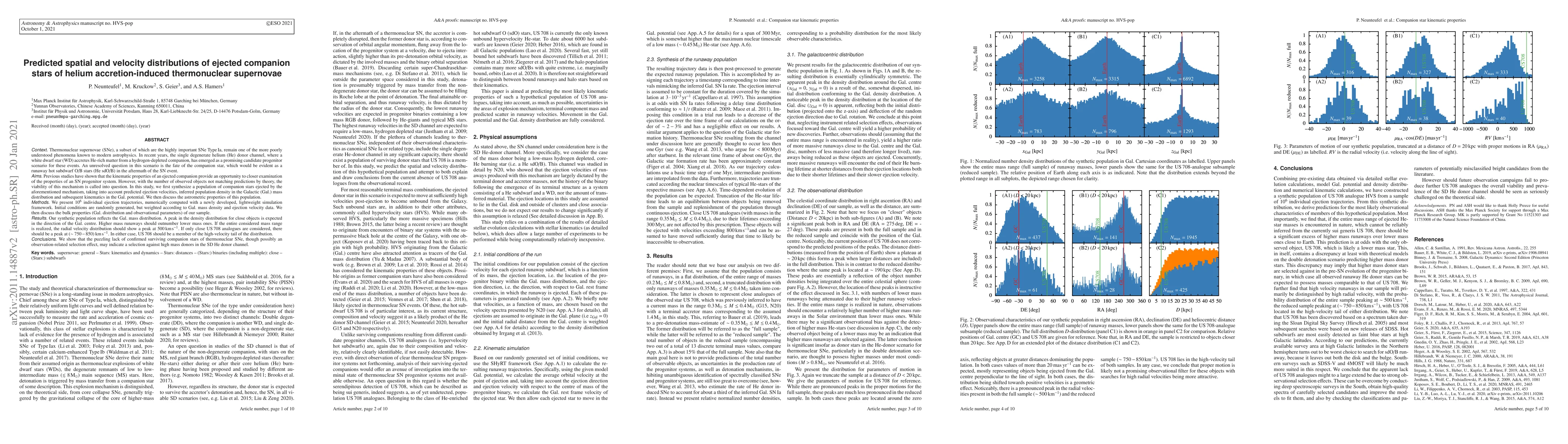 This paper investigates the spatial and velocity distributions of ejected companion stars from helium accretion-induced thermonuclear supernovae, specifically SNe Type Ia. It uses a new simulation framework to model $10^{6}$ ejection trajectories, predicting a peak in the density distribution towards the Galactic center and a radial velocity peak at 500 km/s for the full mass range.