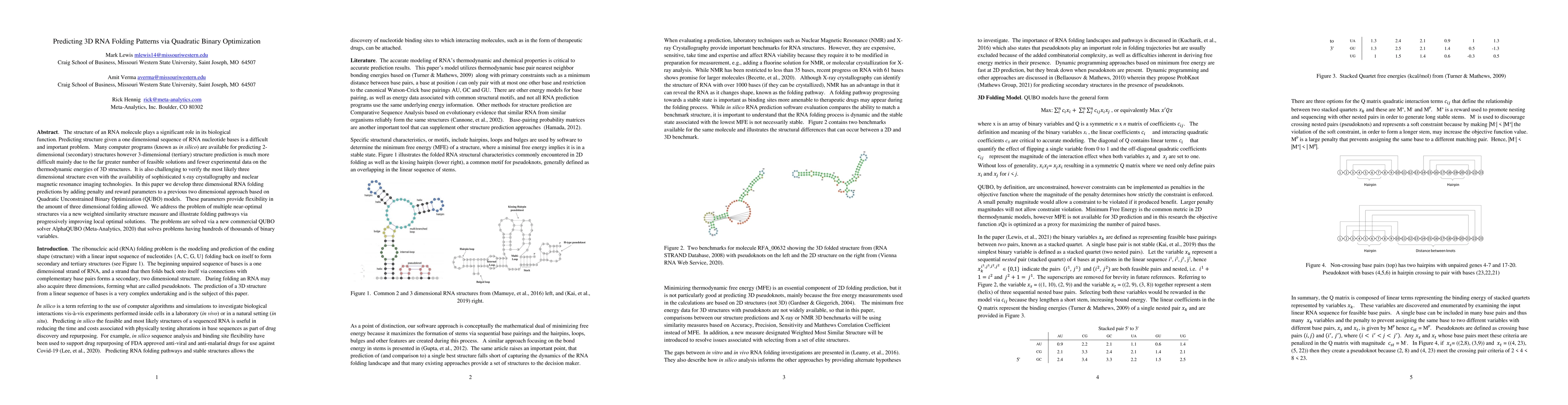 This paper proposes a novel method for predicting 3D RNA folding patterns using Quadratic Unconstrained Binary Optimization (QUBO) models, incorporating penalty and reward parameters to enhance flexibility. The approach addresses the challenge of multiple near-optimal structures through a weighted similarity measure and is solved using a new QUBO solver.