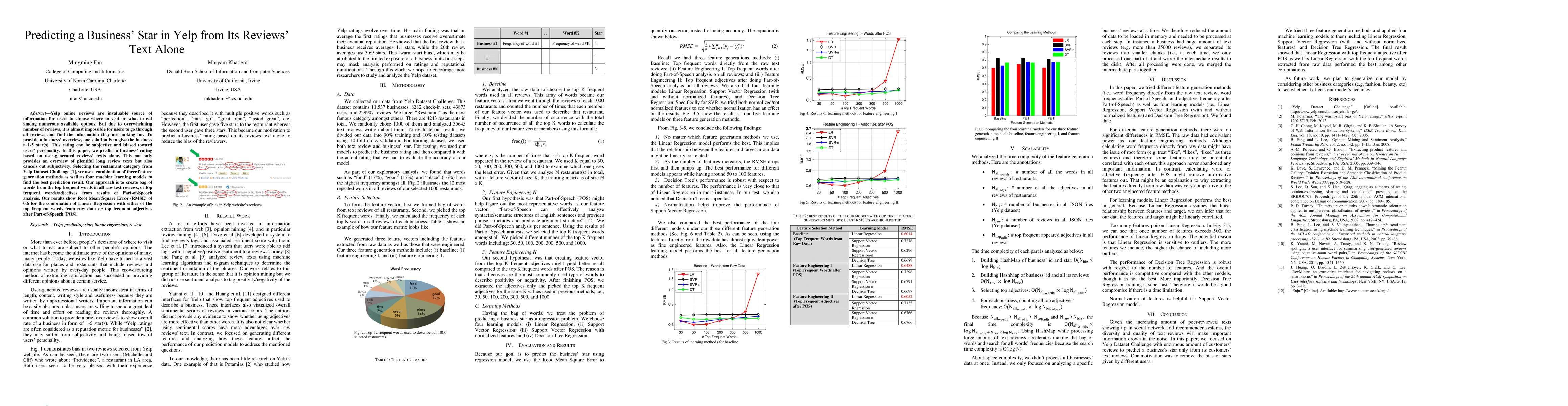 Yelp online reviews are invaluable source of information for users to choose where to visit or what to eat among numerous available options. But due to overwhelming number of reviews, it is almost impossible for users to go through all reviews and find the information they are looking for. To provide a business overview, one solution is to give the business a 1-5 star(s). This rating can be subjective and biased toward users personality. In this paper, we predict a business rating based on user-generated reviews texts alone. This not only provides an overview of plentiful long review texts but also cancels out subjectivity. Selecting the restaurant category from Yelp Dataset Challenge, we use a combination of three feature generation methods as well as four machine learning models to find the best prediction result. Our approach is to create bag of words from the top frequent words in all raw text reviews, or top frequent words/adjectives from results of Part-of-Speech analysis. Our results show Root Mean Square Error (RMSE) of 0.6 for the combination of Linear Regression with either of the top frequent words from raw data or top frequent adjectives after Part-of-Speech (POS).