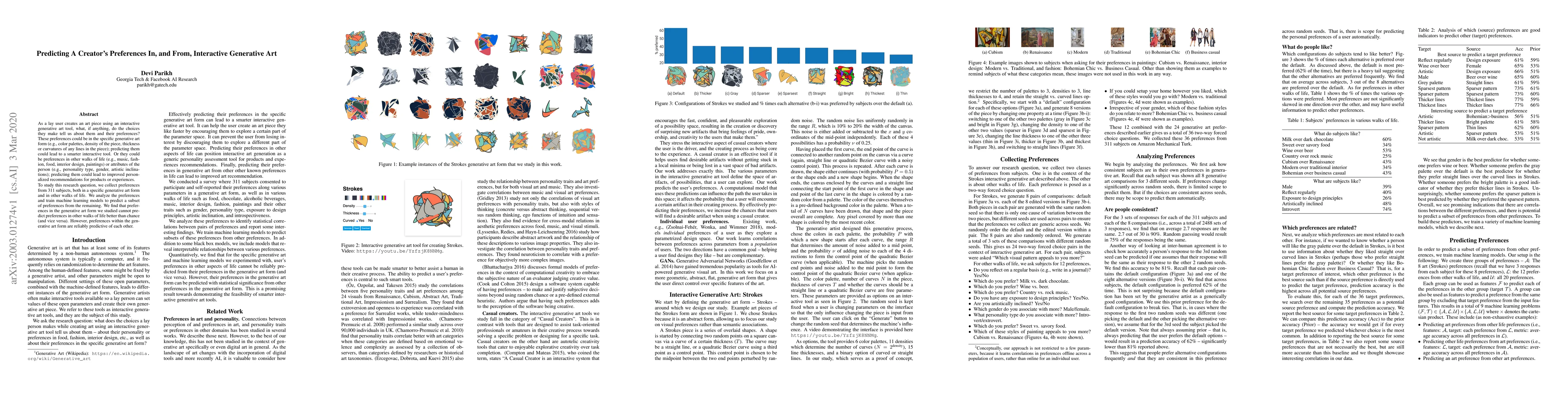 As a lay user creates an art piece using an interactive generative art tool, what, if anything, do the choices they make tell us about them and their preferences? These preferences could be in the specific generative art form (e.g., color palettes, density of the piece, thickness or curvatures of any lines in the piece); predicting them could lead to a smarter interactive tool. Or they could be preferences in other walks of life (e.g., music, fashion, food, interior design, paintings) or attributes of the person (e.g., personality type, gender, artistic inclinations); predicting them could lead to improved personalized recommendations for products or experiences. To study this research question, we collect preferences from 311 subjects, both in a specific generative art form and in other walks of life. We analyze the preferences and train machine learning models to predict a subset of preferences from the remaining. We find that preferences in the generative art form we studied cannot predict preferences in other walks of life better than chance (and vice versa). However, preferences within the generative art form are reliably predictive of each other.