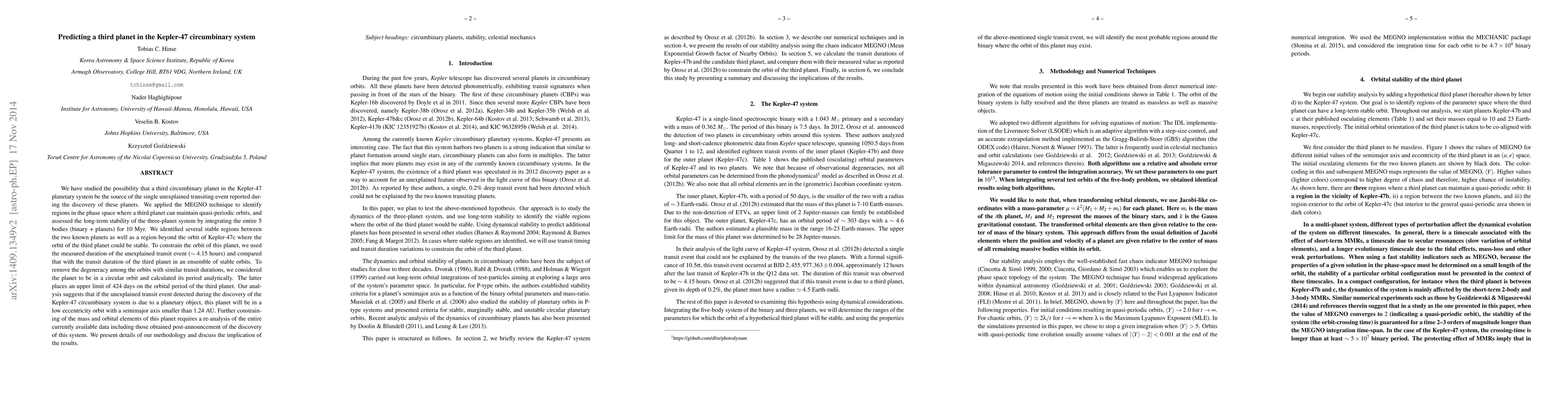 This study explores the potential for a third planet in the Kepler-47 circumbinary system to explain an unexplained transit event. Using the MEGNO technique and long-term stability simulations, the researchers identified stable regions for a third planet and constrained its orbit based on transit duration, suggesting it could have an orbital period of up to 424 days and a semimajor axis less than 1.24 AU.