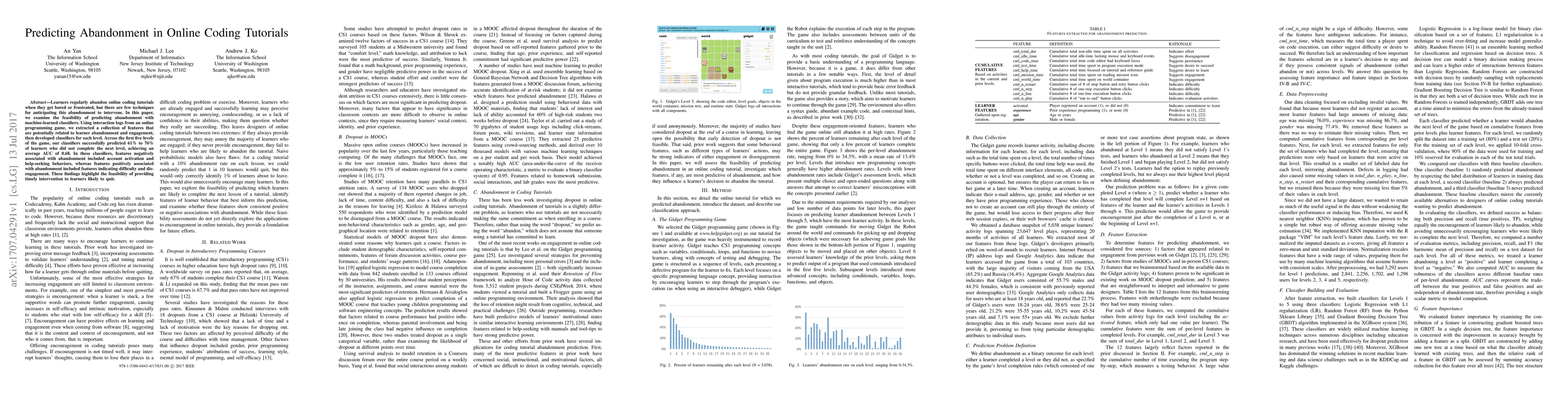 This paper explores the use of machine-learned classifiers to predict learner abandonment in online coding tutorials, achieving 61% to 76% accuracy across the first five levels. Key features include help-seeking behaviors and engagement indicators, suggesting timely intervention could help retain learners.