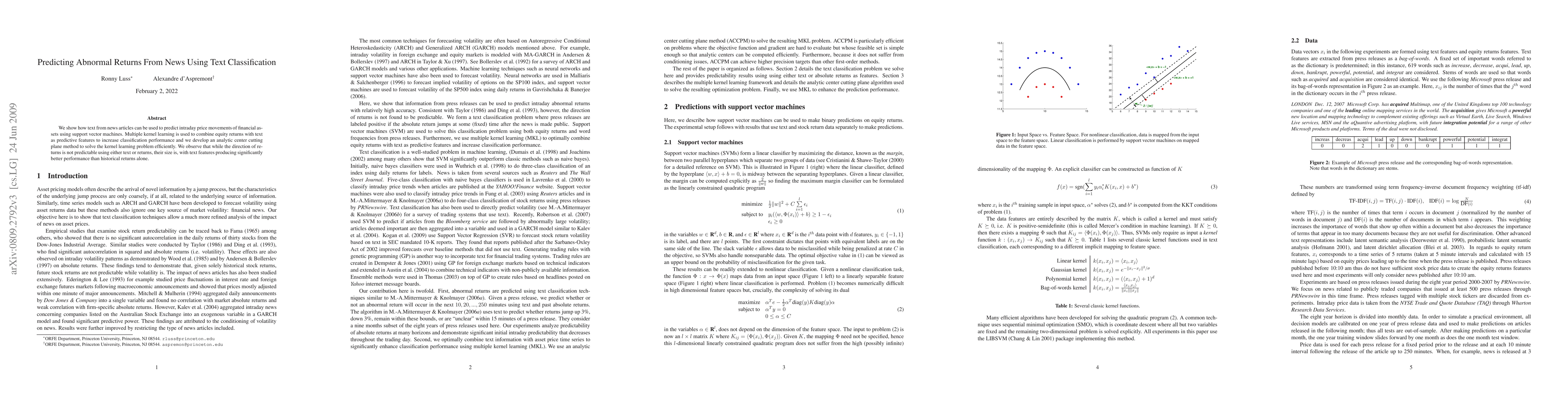 We show how text from news articles can be used to predict intraday price movements of financial assets using support vector machines. Multiple kernel learning is used to combine equity returns with text as predictive features to increase classification performance and we develop an analytic center cutting plane method to solve the kernel learning problem efficiently. We observe that while the direction of returns is not predictable using either text or returns, their size is, with text features producing significantly better performance than historical returns alone.