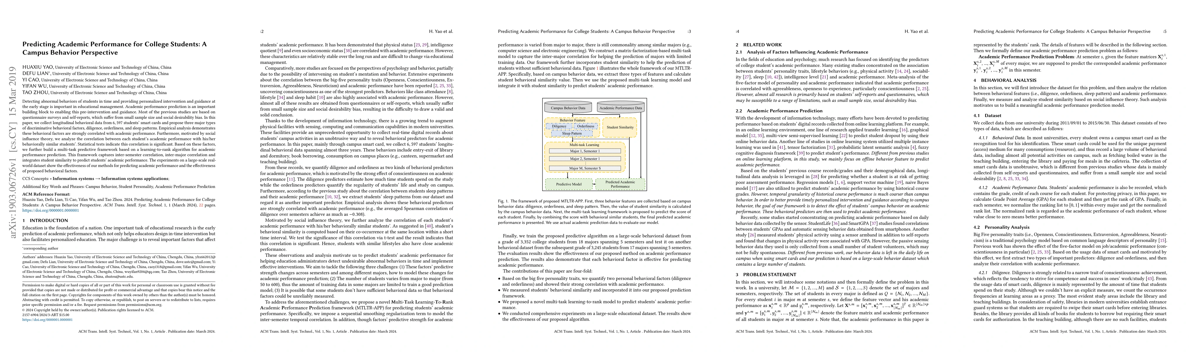 This paper proposes a predictive framework for college students' academic performance using longitudinal behavioral data from smart cards, identifying diligence, orderliness, and sleep patterns as key factors. It also demonstrates significant correlations between students' performance and their behaviorally similar peers, and shows the effectiveness of the proposed multi-task predictive model based on learning-to-rank.
