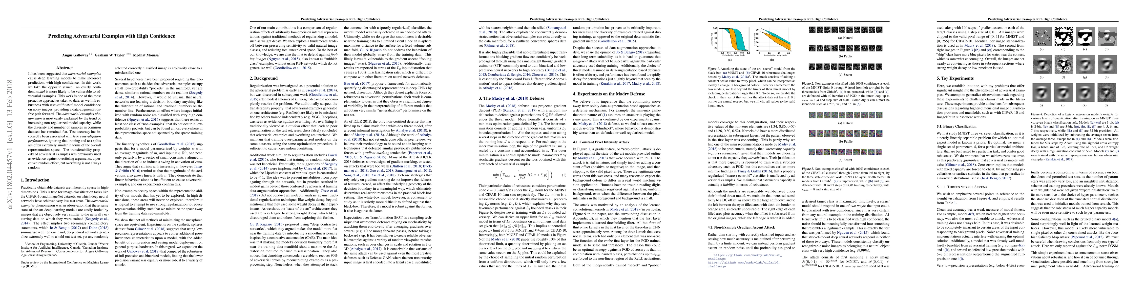 It has been suggested that adversarial examples cause deep learning models to make incorrect predictions with high confidence. In this work, we take the opposite stance: an overly confident model is more likely to be vulnerable to adversarial examples. This work is one of the most proactive approaches taken to date, as we link robustness with non-calibrated model confidence on noisy images, providing a data-augmentation-free path forward. The adversarial examples phenomenon is most easily explained by the trend of increasing non-regularized model capacity, while the diversity and number of samples in common datasets has remained flat. Test accuracy has incorrectly been associated with true generalization performance, ignoring that training and test splits are often extremely similar in terms of the overall representation space. The transferability property of adversarial examples was previously used as evidence against overfitting arguments, a perceived random effect, but overfitting is not always random.