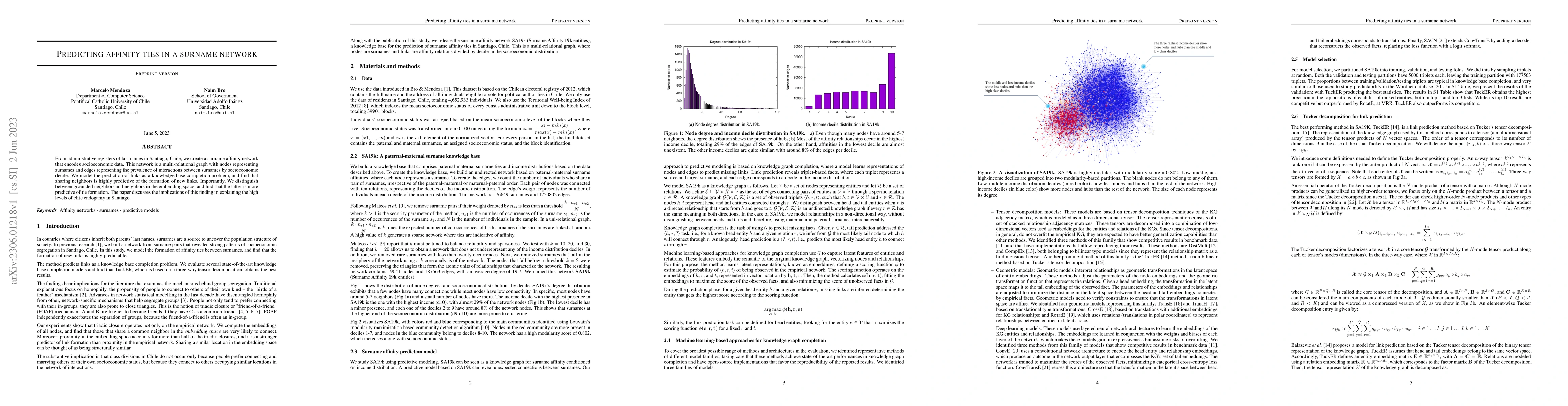 From administrative registers of last names in Santiago, Chile, we create a surname affinity network that encodes socioeconomic data. This network is a multi-relational graph with nodes representing surnames and edges representing the prevalence of interactions between surnames by socioeconomic decile. We model the prediction of links as a knowledge base completion problem, and find that sharing neighbors is highly predictive of the formation of new links. Importantly, We distinguish between grounded neighbors and neighbors in the embedding space, and find that the latter is more predictive of tie formation. The paper discusses the implications of this finding in explaining the high levels of elite endogamy in Santiago.