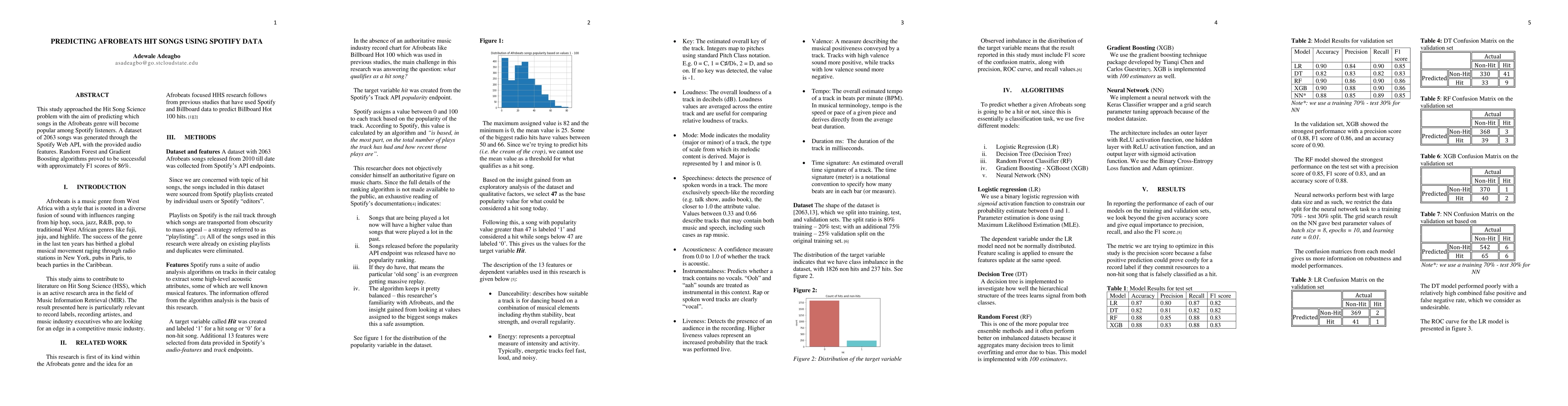 This study predicts Afrobeats hit songs' popularity on Spotify using Random Forest and Gradient Boosting algorithms, achieving an F1 score of around 86% with a dataset of 2063 songs. The research leverages audio features from the Spotify Web API for analysis.