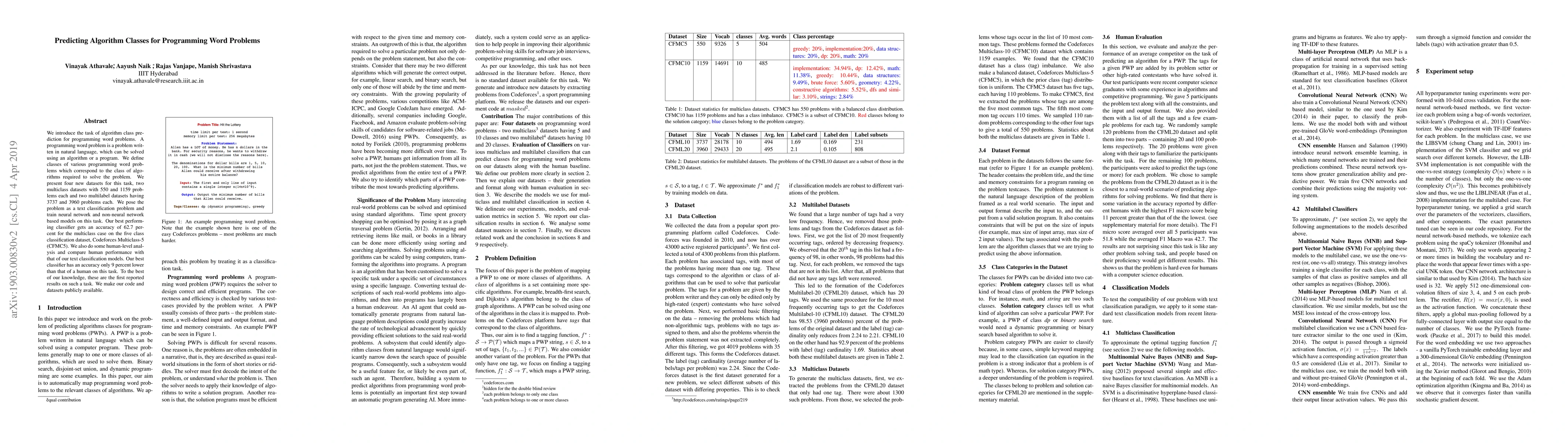 We introduce the task of algorithm class prediction for programming word problems. A programming word problem is a problem written in natural language, which can be solved using an algorithm or a program. We define classes of various programming word problems which correspond to the class of algorithms required to solve the problem. We present four new datasets for this task, two multiclass datasets with 550 and 1159 problems each and two multilabel datasets having 3737 and 3960 problems each. We pose the problem as a text classification problem and train neural network and non-neural network-based models on this task. Our best performing classifier gets an accuracy of 62.7 percent for the multiclass case on the five class classification dataset, Codeforces Multiclass-5 (CFMC5). We also do some human-level analysis and compare human performance with that of our text classification models. Our best classifier has an accuracy only 9 percent lower than that of a human on this task. To the best of our knowledge, these are the first reported results on such a task. We make our code and datasets publicly available.