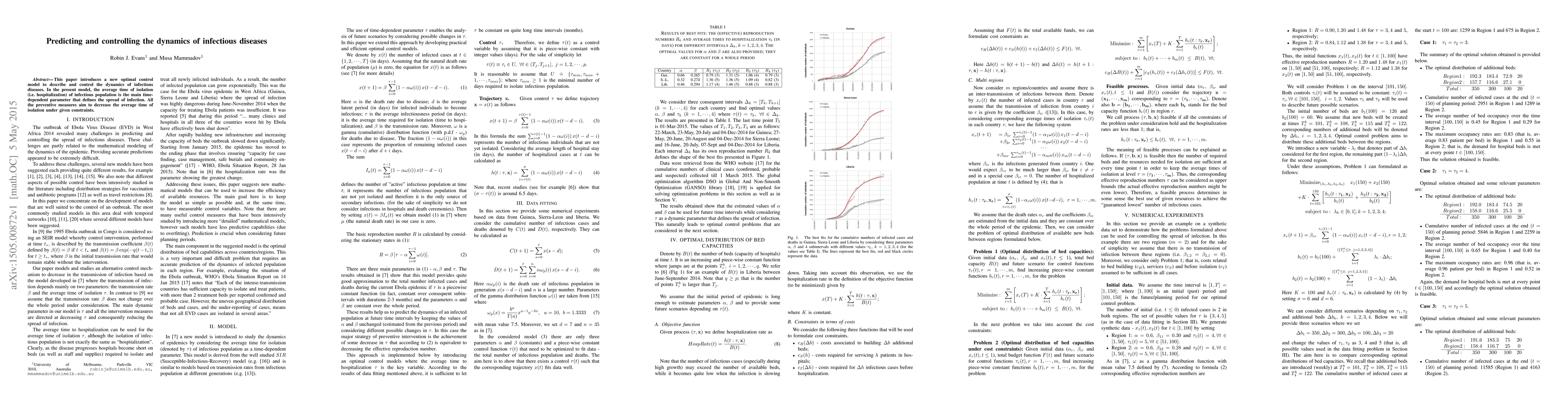 This paper proposes an optimal control model to predict and manage infectious disease dynamics, focusing on reducing the average isolation time through preventive measures within specified constraints. The model aims to optimize the control strategies to mitigate infection spread.
