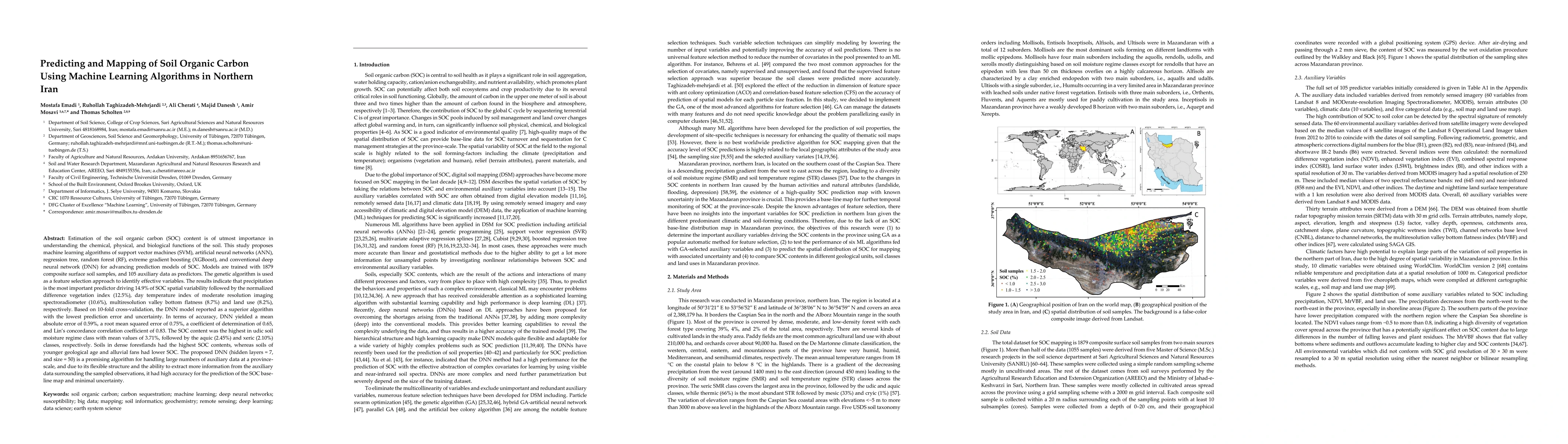 This study employs various machine learning algorithms to predict and map soil organic carbon (SOC) in Northern Iran, identifying precipitation as the key predictor. The deep neural network (DNN) model demonstrated superior accuracy, achieving a mean absolute error of 59 percent and a coefficient of determination of 0.65, making it effective for large-scale SOC prediction.