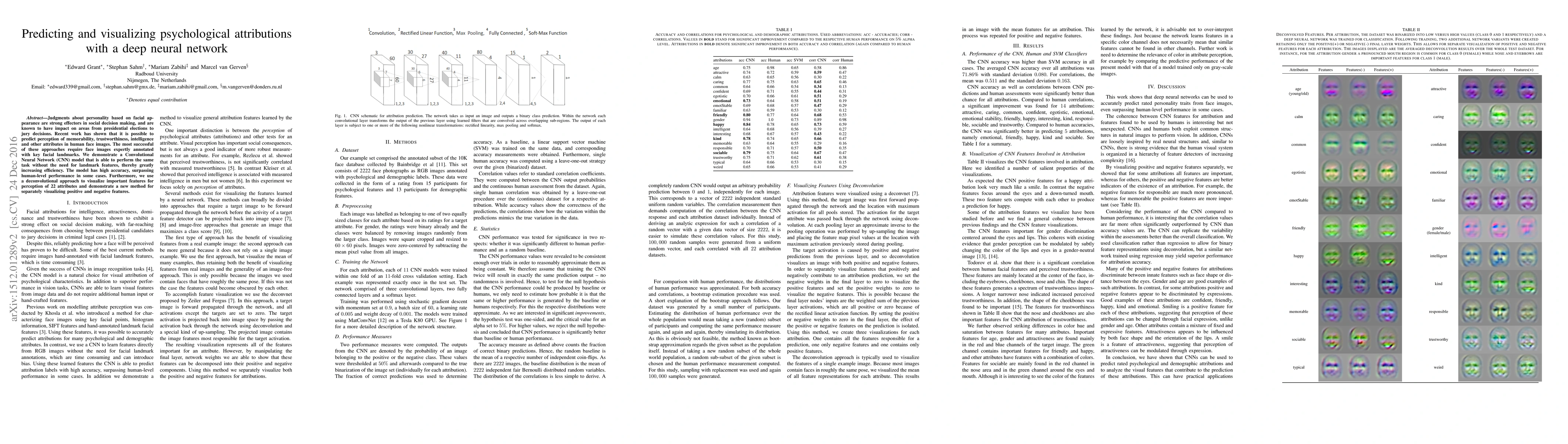 A deep neural network model successfully predicts human judgments of personality traits from facial appearance without landmark features, achieving high accuracy and visualizing important attributes.
