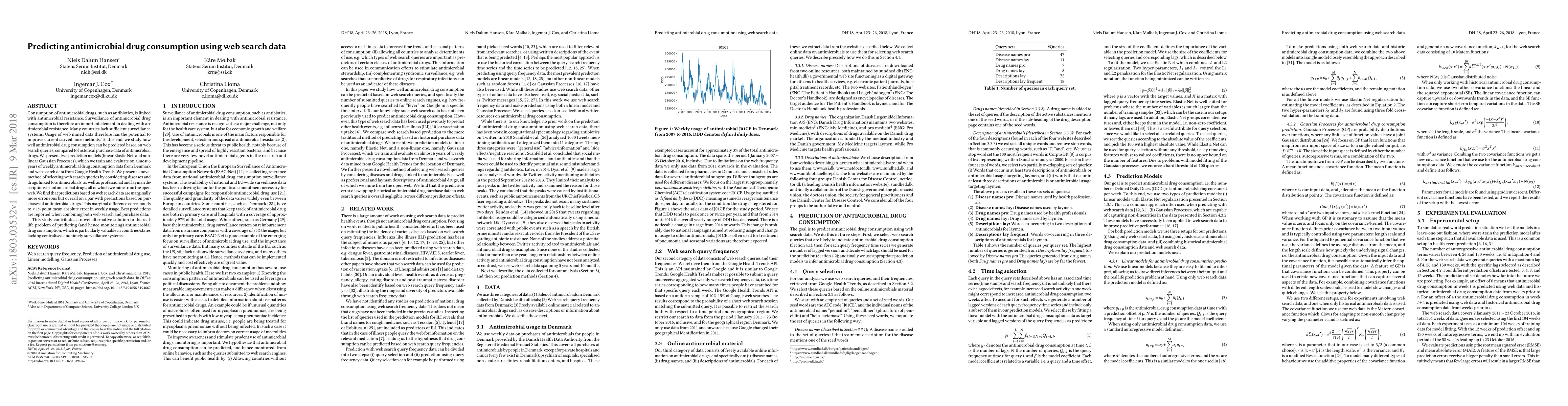 Consumption of antimicrobial drugs, such as antibiotics, is linked with antimicrobial resistance. Surveillance of antimicrobial drug consumption is therefore an important element in dealing with antimicrobial resistance. Many countries lack sufficient surveillance systems. Usage of web mined data therefore has the potential to improve current surveillance methods. To this end, we study how well antimicrobial drug consumption can be predicted based on web search queries, compared to historical purchase data of antimicrobial drugs. We present two prediction models (linear Elastic Net, and non-linear Gaussian Processes), which we train and evaluate on almost 6 years of weekly antimicrobial drug consumption data from Denmark and web search data from Google Health Trends. We present a novel method of selecting web search queries by considering diseases and drugs linked to antimicrobials, as well as professional and layman descriptions of antimicrobial drugs, all of which we mine from the open web. We find that predictions based on web search data are marginally more erroneous but overall on a par with predictions based on purchases of antimicrobial drugs. This marginal difference corresponds to $<1$\% point mean absolute error in weekly usage. Best predictions are reported when combining both web search and purchase data. This study contributes a novel alternative solution to the real-life problem of predicting (and hence monitoring) antimicrobial drug consumption, which is particularly valuable in countries/states lacking centralised and timely surveillance systems.