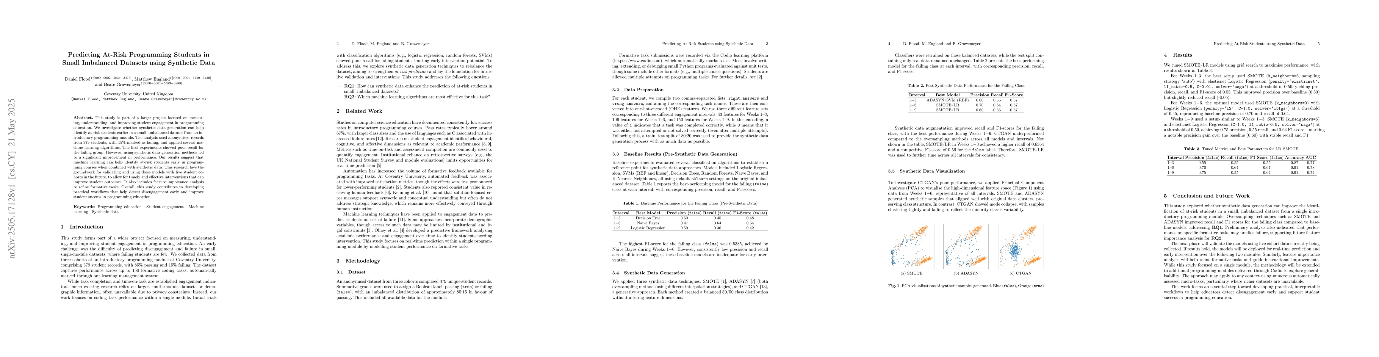 This work introduces the use of synthetic data generation to address the challenge of poor recall in identifying failing students within small, imbalanced programming education datasets.