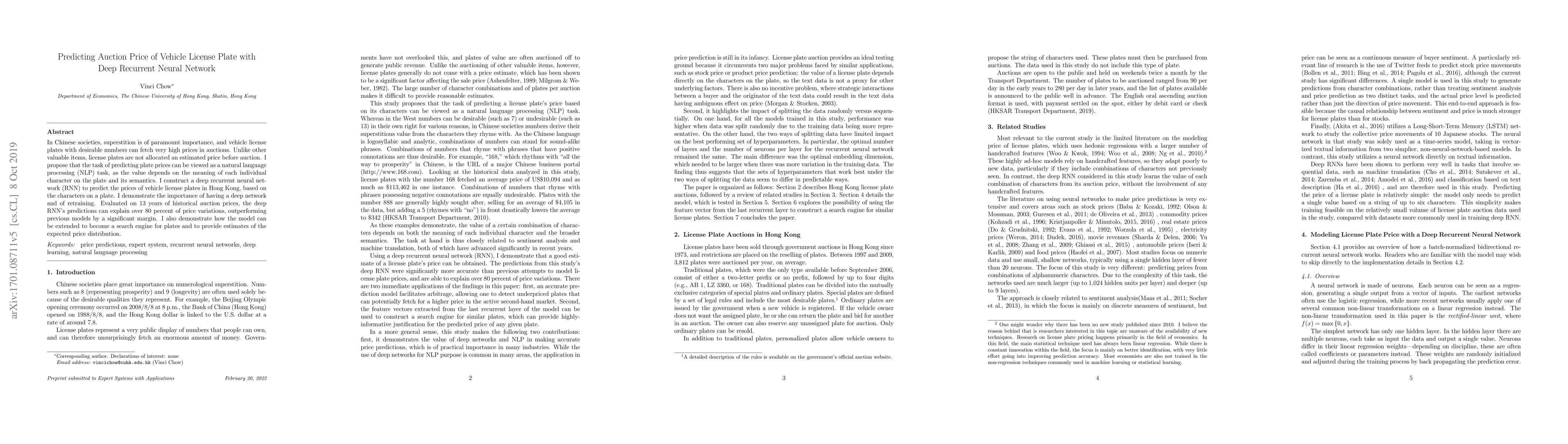 A deep recurrent neural network successfully predicts vehicle license plate prices with 80% accuracy in Hong Kong auctions, outperforming previous models.