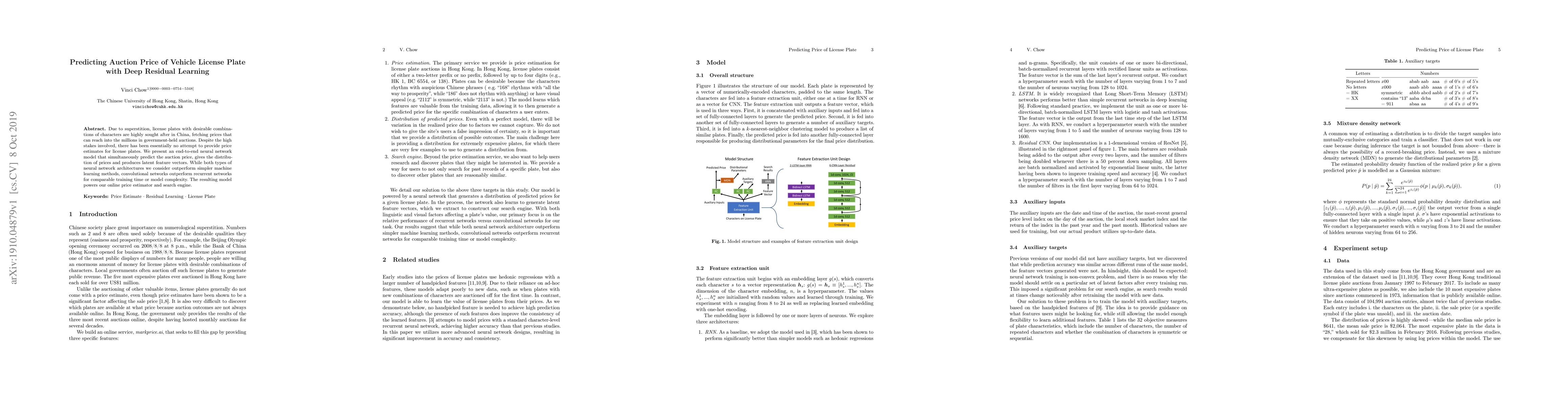Due to superstition, license plates with desirable combinations of characters are highly sought after in China, fetching prices that can reach into the millions in government-held auctions. Despite the high stakes involved, there has been essentially no attempt to provide price estimates for license plates. We present an end-to-end neural network model that simultaneously predict the auction price, gives the distribution of prices and produces latent feature vectors. While both types of neural network architectures we consider outperform simpler machine learning methods, convolutional networks outperform recurrent networks for comparable training time or model complexity. The resulting model powers our online price estimator and search engine.