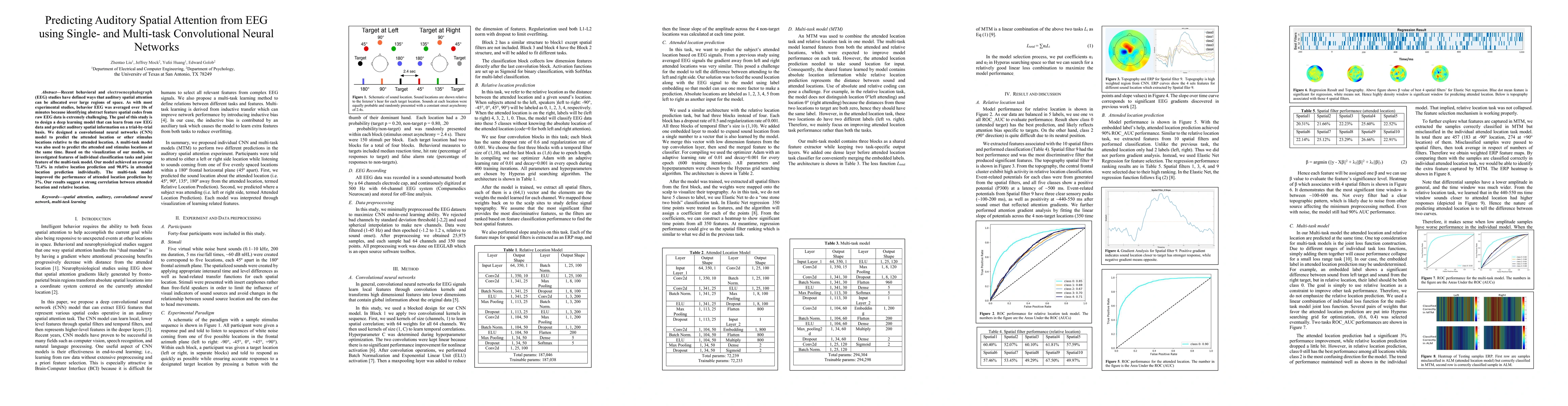 This study develops convolutional neural networks (CNN) to predict auditory spatial attention from raw EEG data on a trial-by-trial basis, achieving 72.4% accuracy for relative location and 90.0% for attended location. A multi-task model enhanced attended location prediction by 3%, indicating a strong correlation between attended and relative locations.
