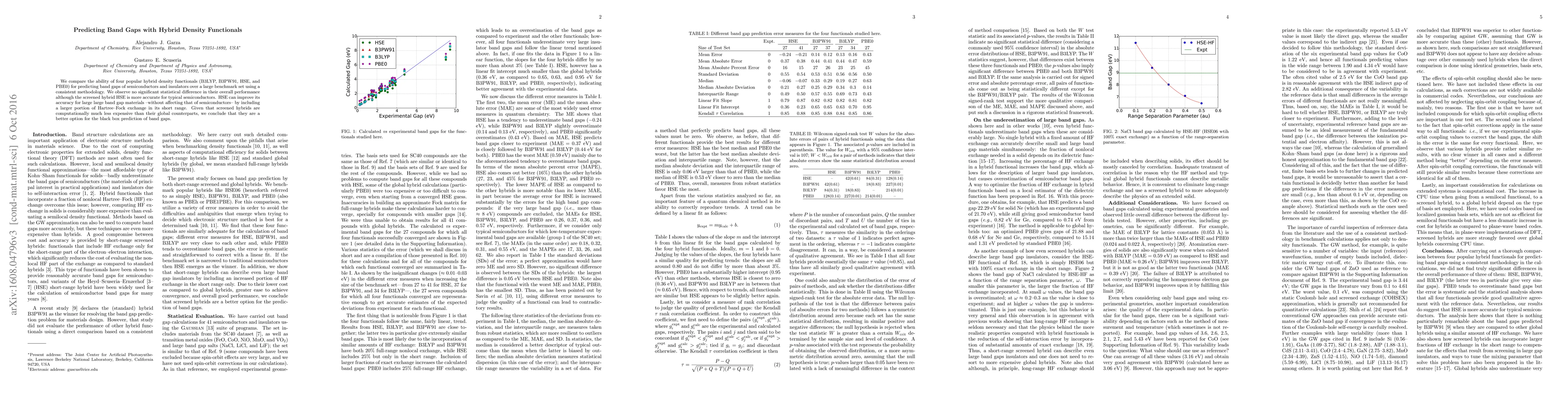 This research compares four hybrid density functionals (B3LYP, B3PW91, HSE, PBE0) for predicting band gaps of semiconductors and insulators. While all performed similarly, the screened hybrid HSE showed better accuracy for typical semiconductors and large band gap materials. HSE's accuracy can be enhanced for large band gap materials without affecting semiconductor accuracy by increasing short-range Hartree-Fock exchange. Given their lower computational cost compared to global hybrids, screened hybrids are recommended for band gap prediction.