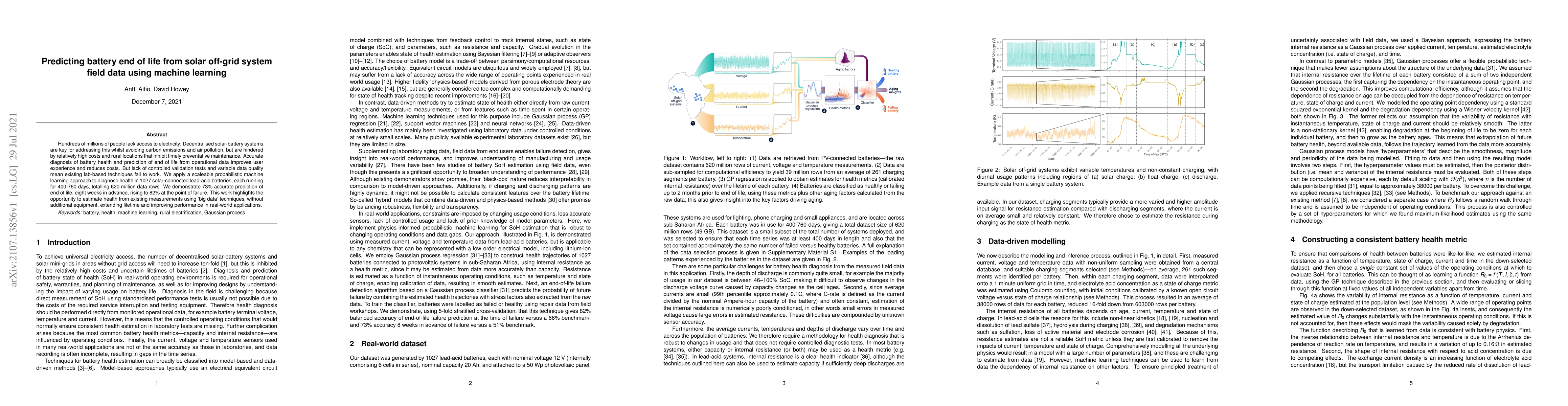 Hundreds of millions of people lack access to electricity. Decentralised solar-battery systems are key for addressing this whilst avoiding carbon emissions and air pollution, but are hindered by relatively high costs and rural locations that inhibit timely preventative maintenance. Accurate diagnosis of battery health and prediction of end of life from operational data improves user experience and reduces costs. But lack of controlled validation tests and variable data quality mean existing lab-based techniques fail to work. We apply a scaleable probabilistic machine learning approach to diagnose health in 1027 solar-connected lead-acid batteries, each running for 400-760 days, totalling 620 million data rows. We demonstrate 73% accurate prediction of end of life, eight weeks in advance, rising to 82% at the point of failure. This work highlights the opportunity to estimate health from existing measurements using `big data' techniques, without additional equipment, extending lifetime and improving performance in real-world applications.