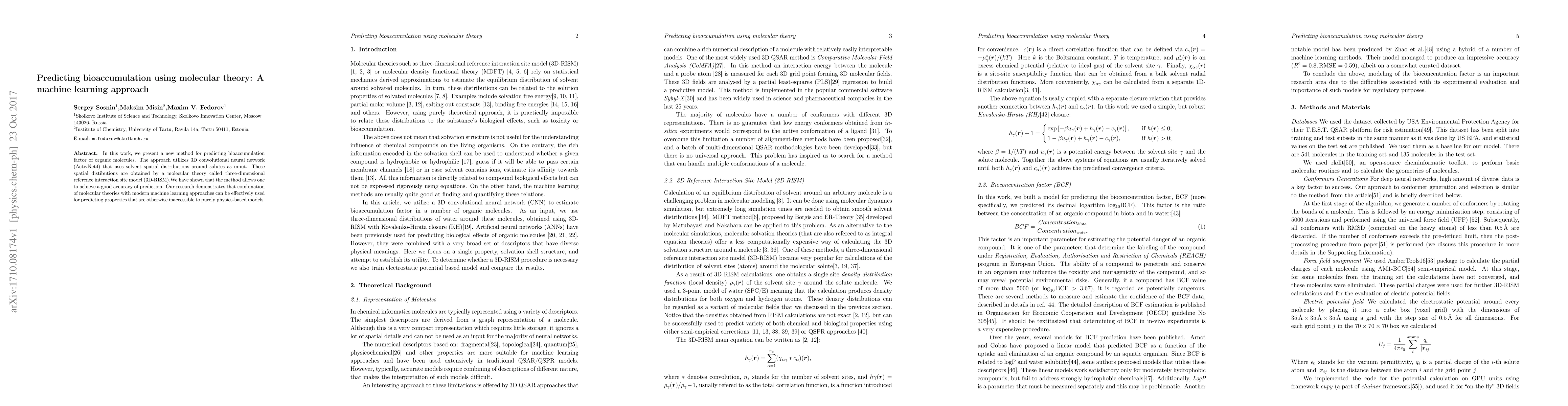 In this work, we present a new method for predicting bioaccumulation factor of organic molecules. The approach utilizes 3D convolutional neural network (ActivNet4) that uses solvent spatial distributions around solutes as input. These spatial distributions are obtained by a molecular theory called three-dimensional reference interaction site model (3D-RISM). We have shown that the method allows one to achieve a good accuracy of prediction. Our research demonstrates that combination of molecular theories with modern machine learning approaches can be effectively used for predicting properties that are otherwise inaccessible to purely physics-based models.