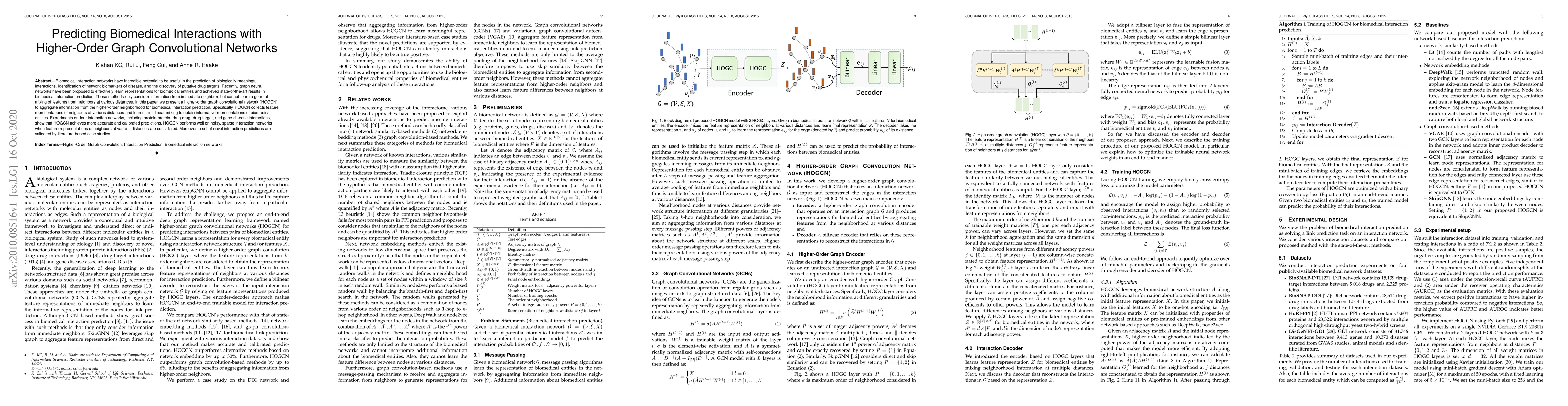 This paper introduces a higher-order graph convolutional network (HOGCN) to enhance biomedical interaction prediction by incorporating information from neighbors at various distances, achieving more accurate and calibrated predictions compared to existing methods. HOGCN's performance is validated through experiments on multiple interaction networks and case studies.